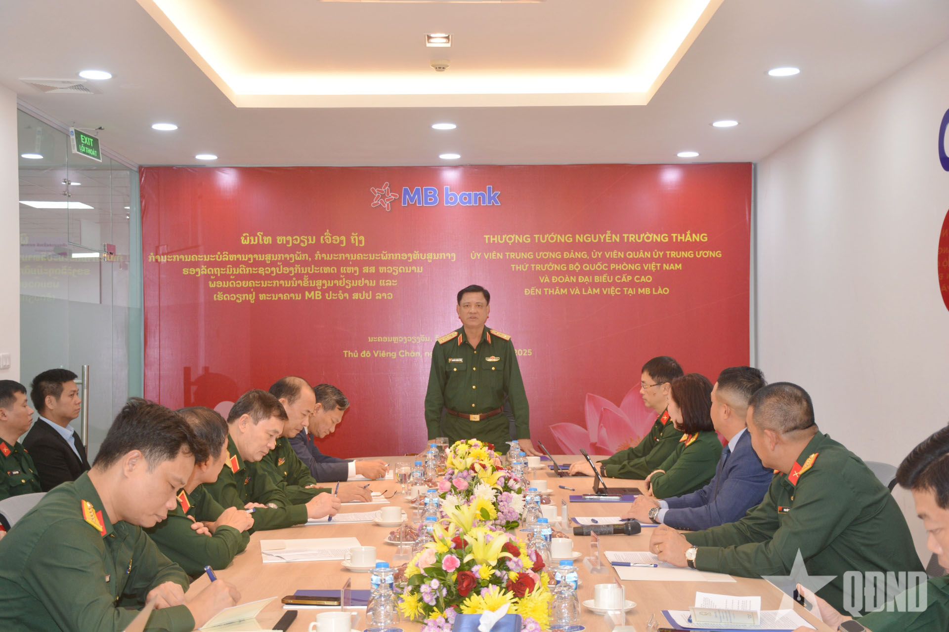 Phát biểu chỉ đạo tại buổi làm việc, Thượng tướng Nguyễn Trường Thắng đánh giá cao sự đoàn kết, nỗ lực không ngừng của các cán bộ, nhân viên, người lao động tại MB Lào đã hoàn thành tốt nhiệm vụ đơn vị và nhiệm vụ chính trị của ngành ngân hàng nói chung, góp phần không nhỏ vào sự phát triển kinh tế, văn hóa, xã hội tại Lào, cũng như góp phần vun đắp tình hữu nghị Việt Nam - Lào.