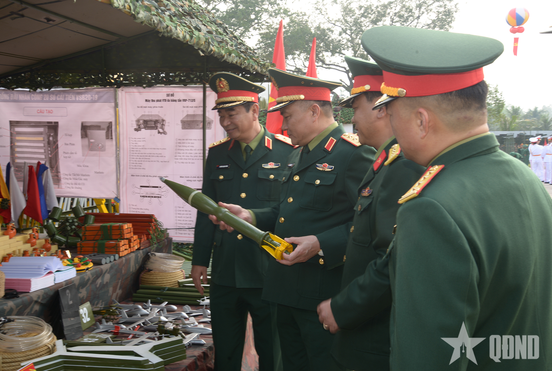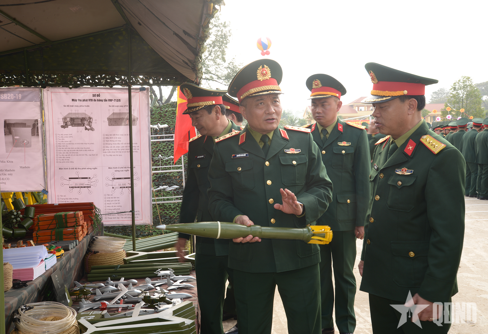 Thượng tướng Nguyễn Văn Hiền kiểm tra mô hình, vật chất huấn luyện trưng bày tại buổi lễ.