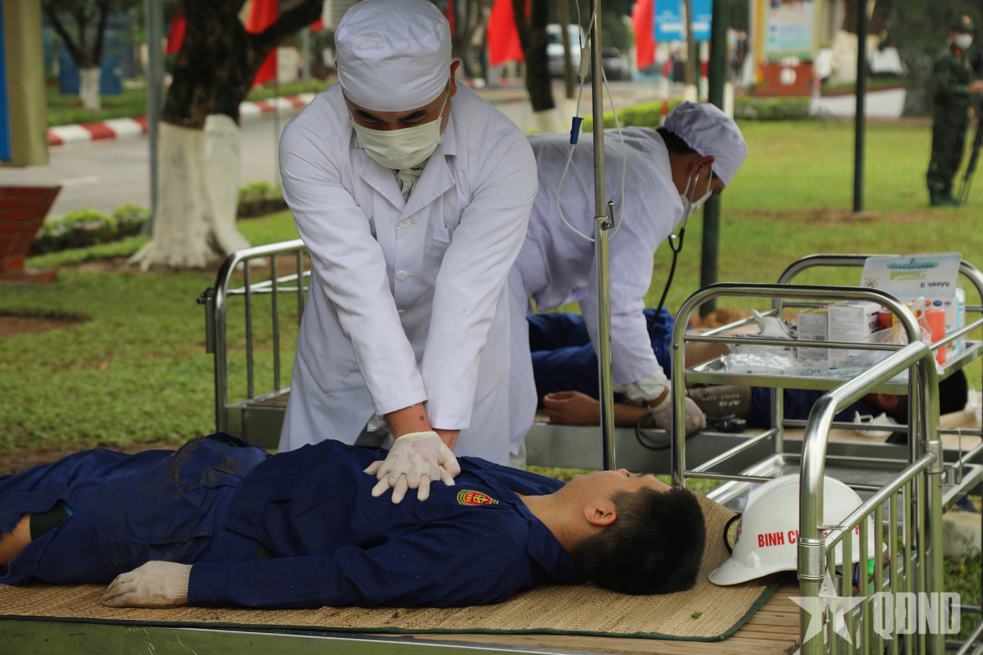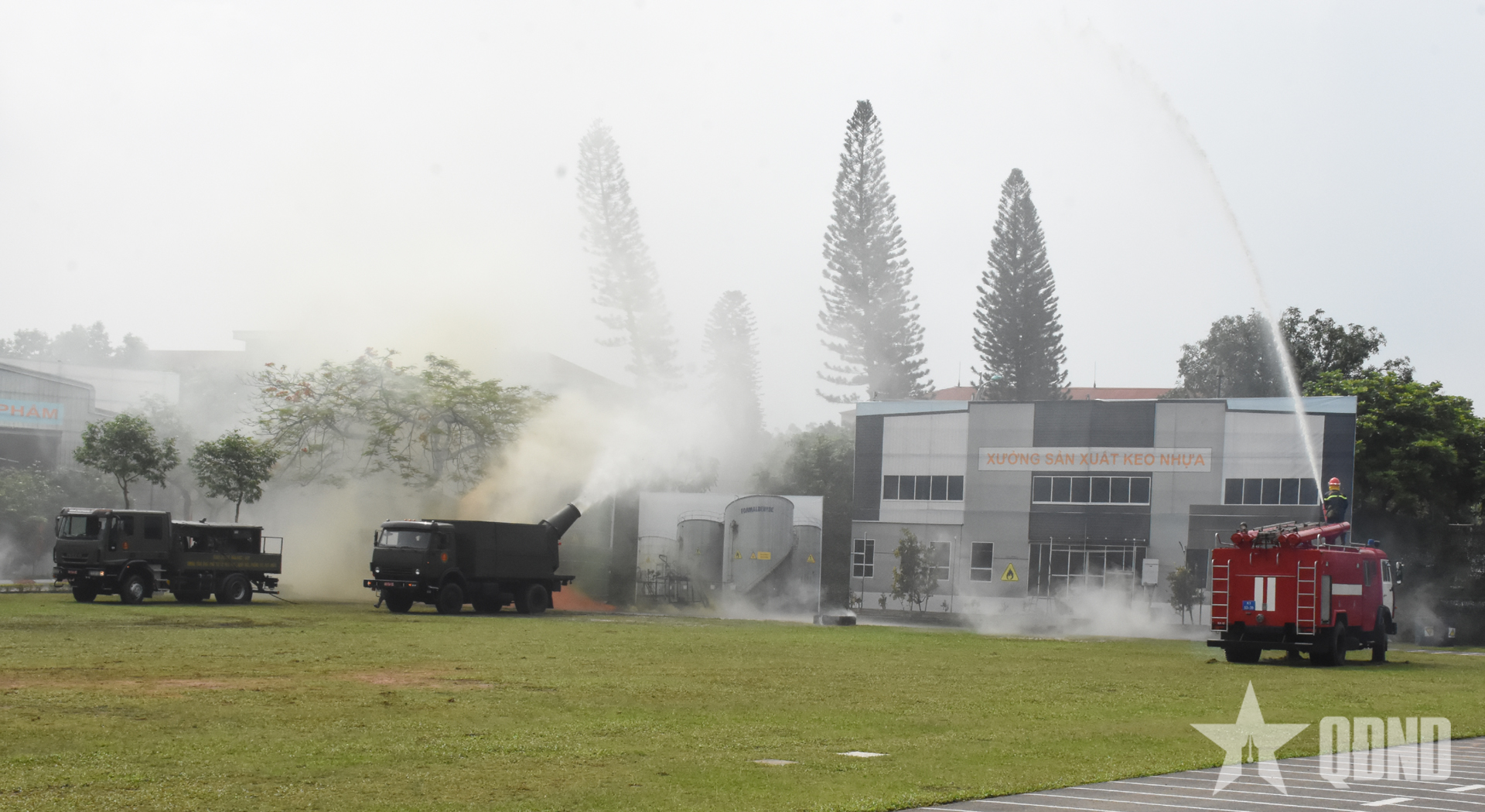 Sau lễ phát động, các đại biểu xem trình diễn phương án ứng phó sự cố hóa chất độc, phóng xạ và môi trường do cán bộ, chiến sĩ Lữ đoàn 86, Binh chủng Hóa học thực hiện.