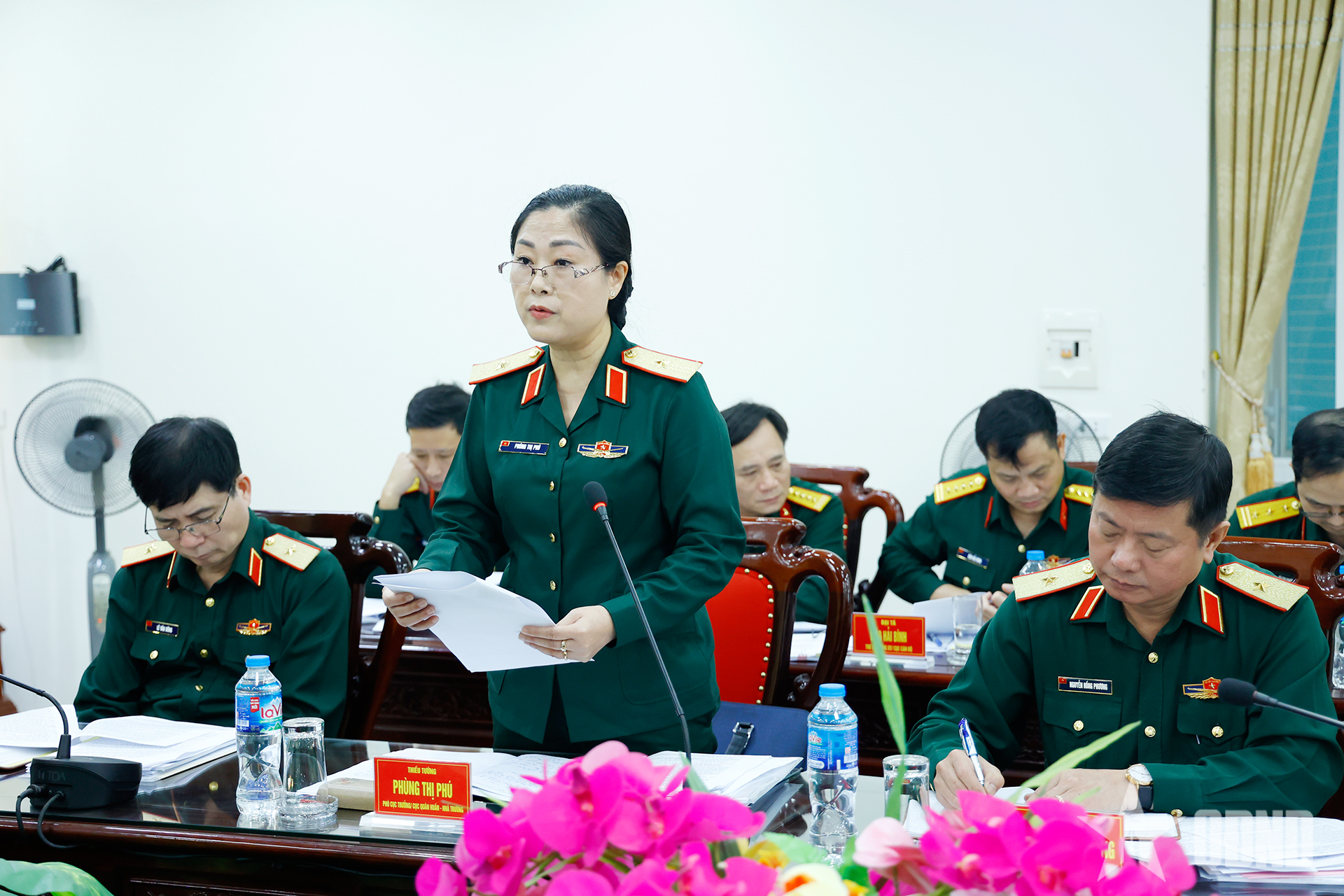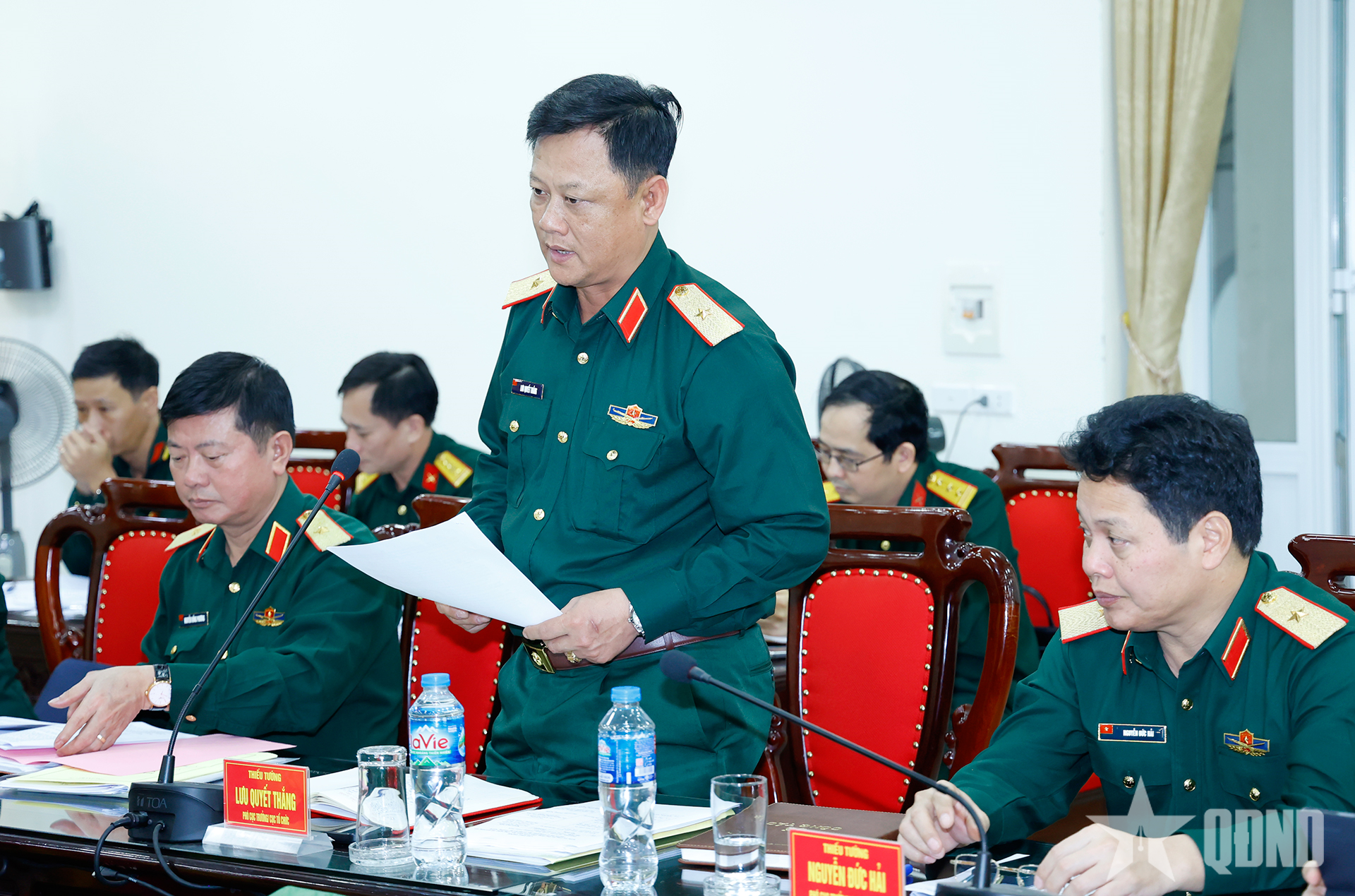 Đại diện Ban giám hiệu Trường Sĩ quan Pháo binh trình bày báo cáo tại buổi kiểm tra.