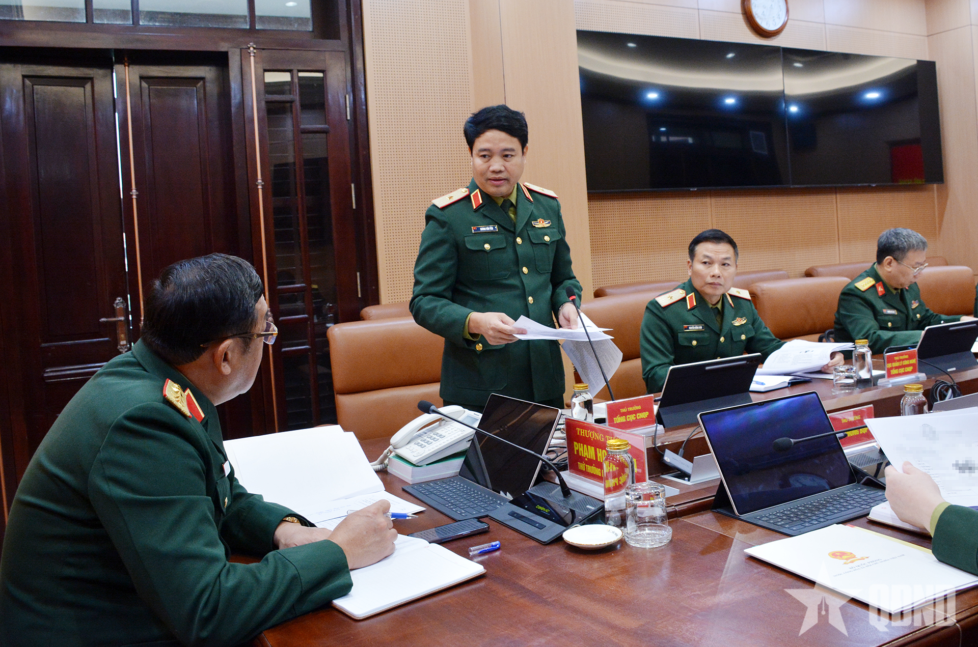 Thủ trưởng Tổng cục Công nghiệp Quốc phòng trình bày báo cáo tại hội nghị.