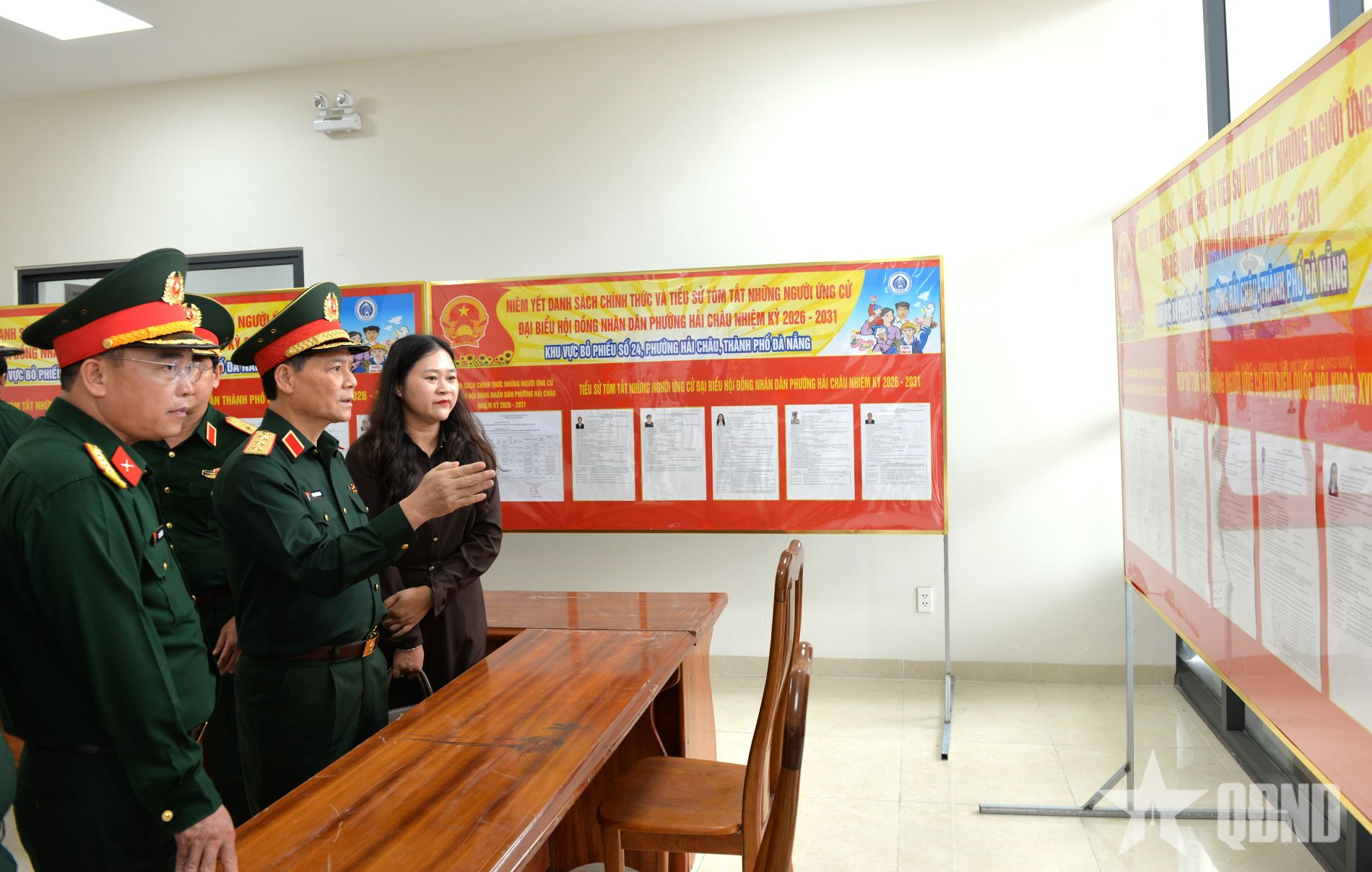 Thượng tướng Phạm Trường Sơn kiểm tra niêm yết danh sách người ứng cử tại Tổ bầu cử cơ quan Bộ CHQS TP Đà Nẵng.