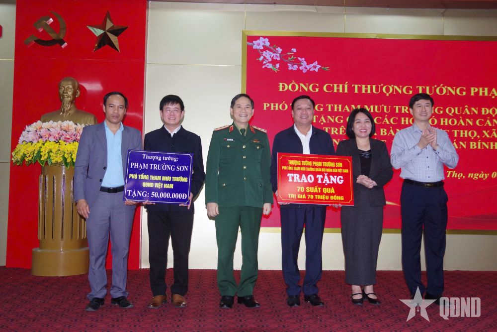 Chiều cùng ngày, Thượng tướng Phạm Trường Sơn cùng đoàn công tác đã thăm, tặng hơn 120 suất quà (mỗi suất trị giá 1 triệu đồng) cho các hộ gia đình chính sách trên địa bàn xã Đức Thọ và xã Đức Đồng, tỉnh Hà Tĩnh.