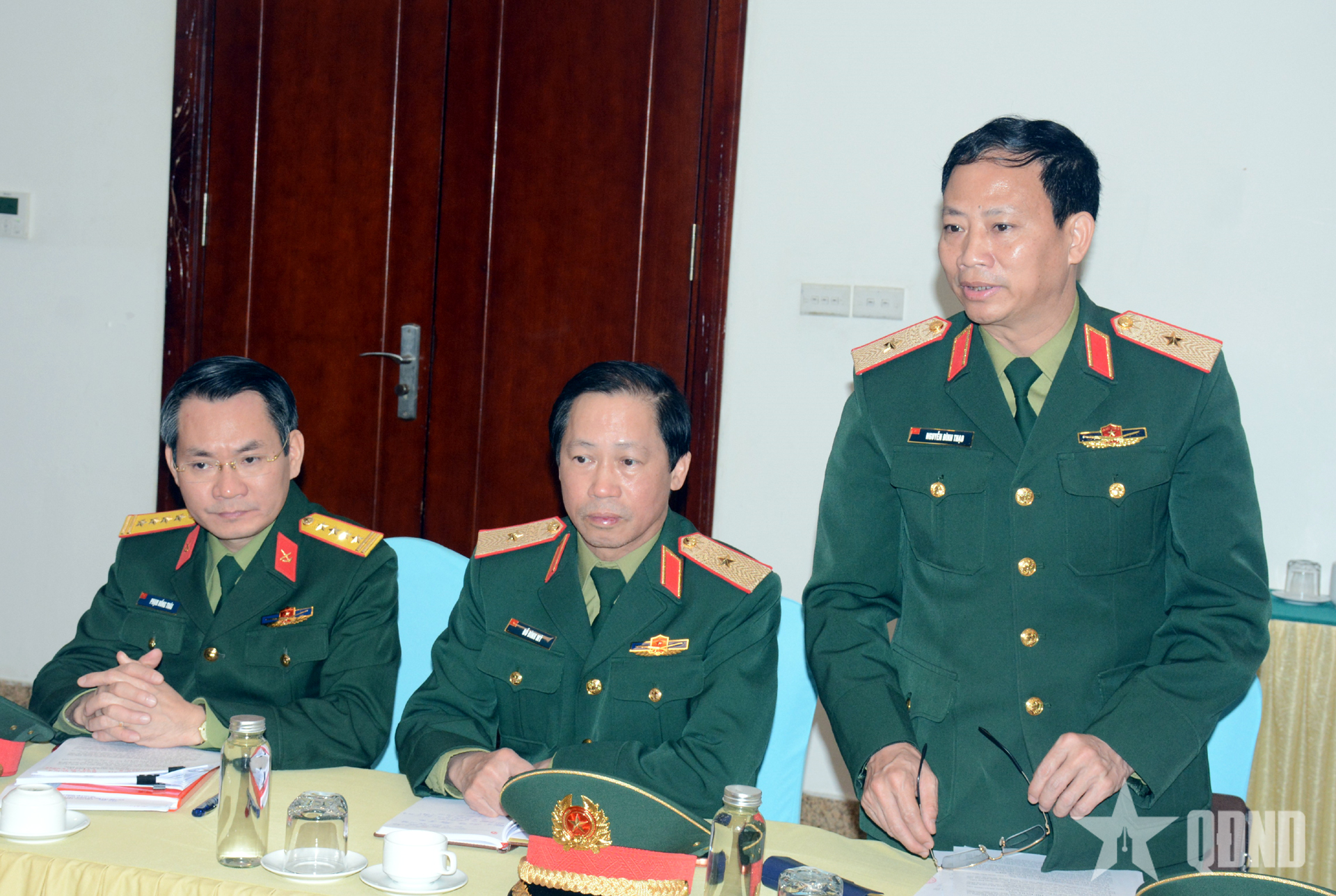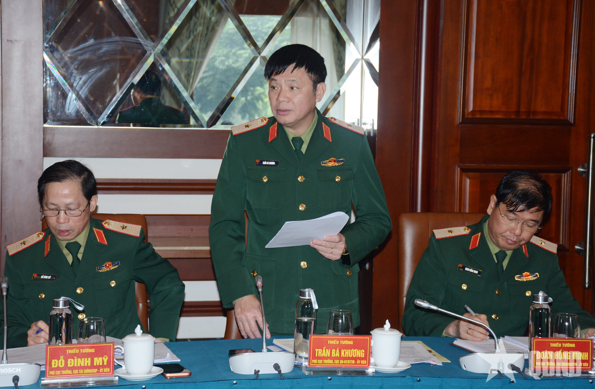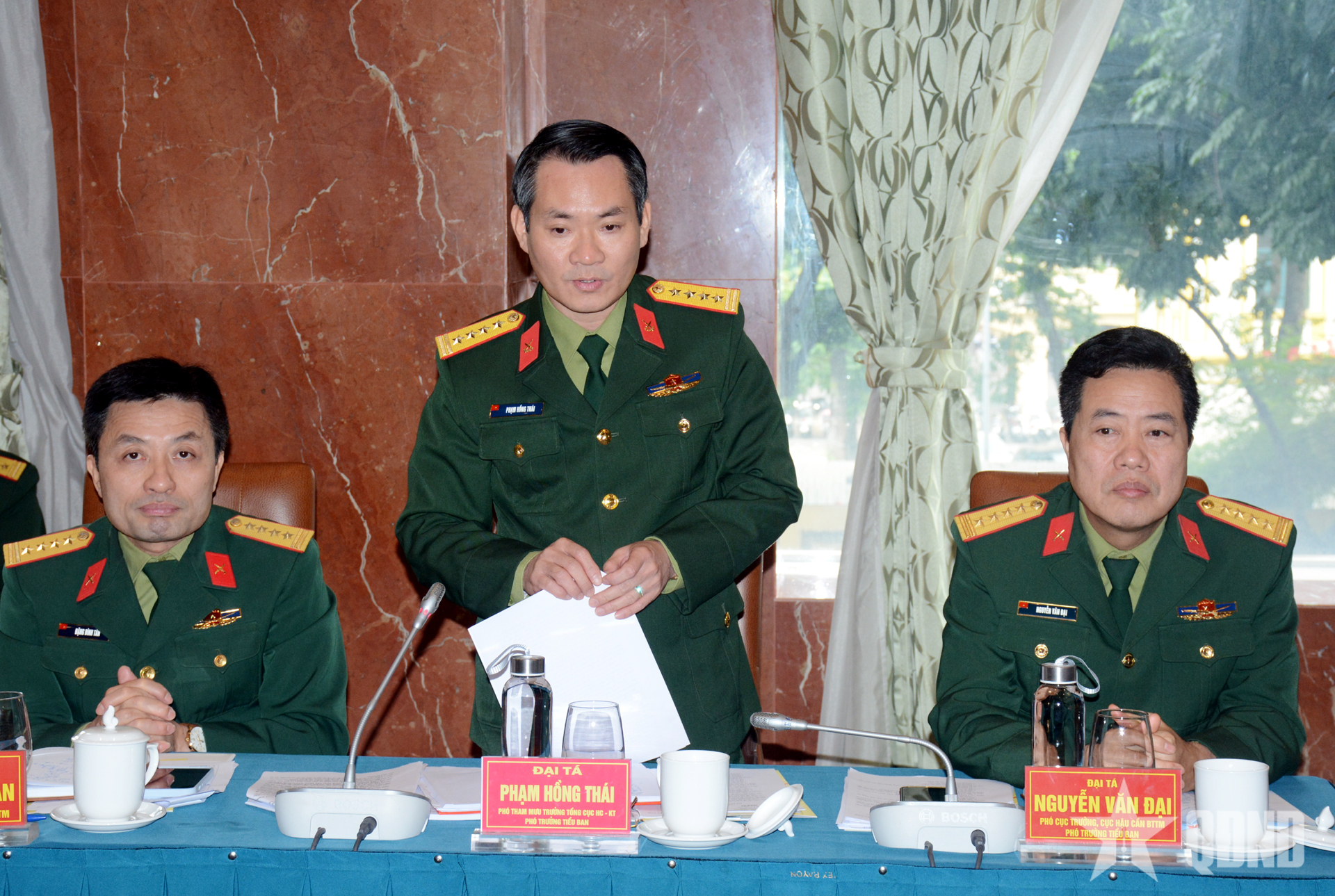 Đại tá Phạm Hồng Thái, Phó tham mưu trưởng Tổng cục Hậu cần - Kỹ thuật, Phó trưởng Tiểu ban phát biểu làm rõ một số nội dung liên quan tại buổi kiểm tra.