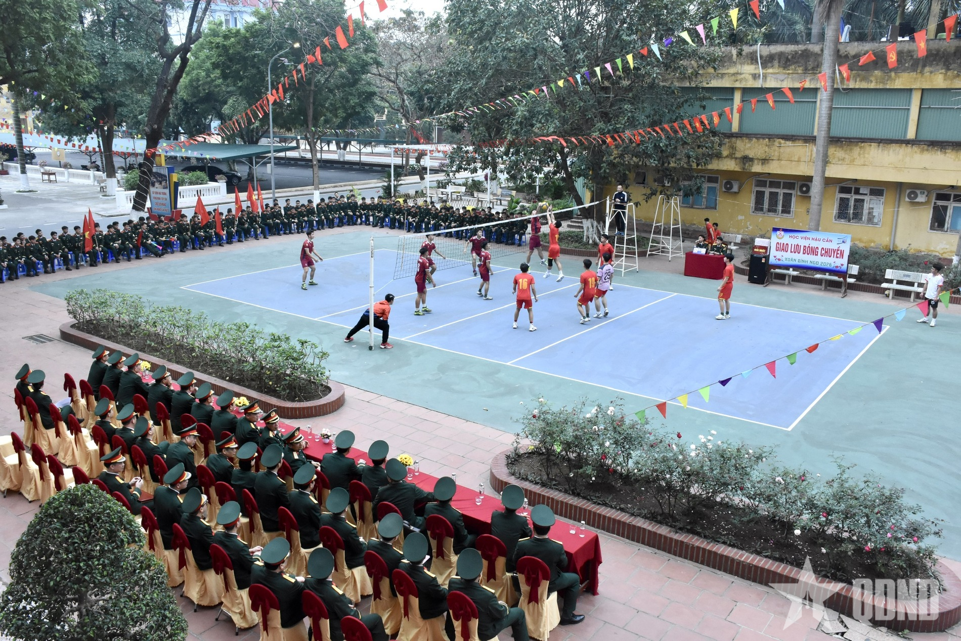 Đoàn công tác cổ vũ cán bộ, nhân viên, học viên của Học viện Hậu cần thi đấu bóng chuyền.