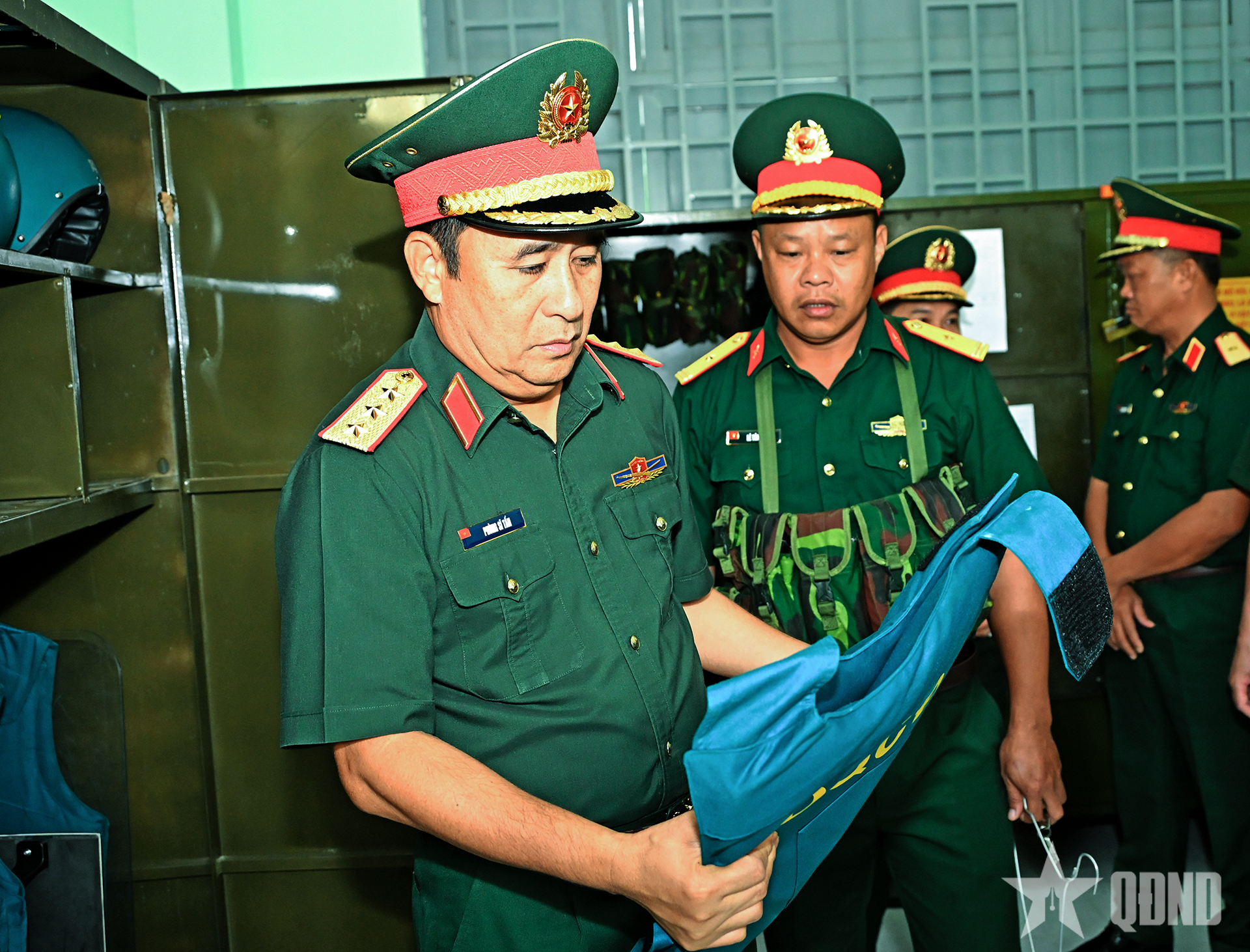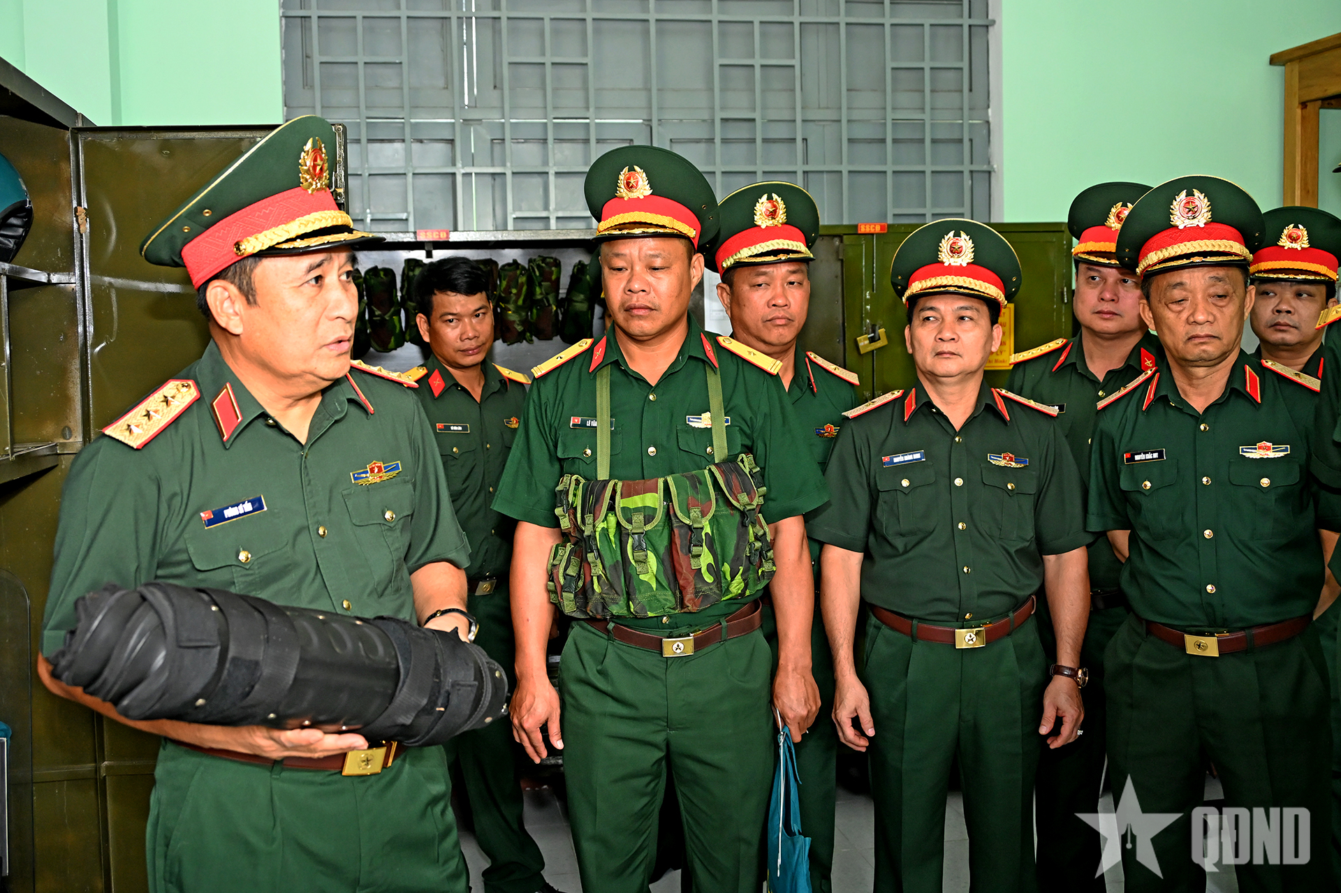 Thượng tướng Phùng Sĩ Tấn kiểm tra vũ khí, trang bị của Ban chỉ huy Phòng thủ khu vực 2 - Đak Pơ.