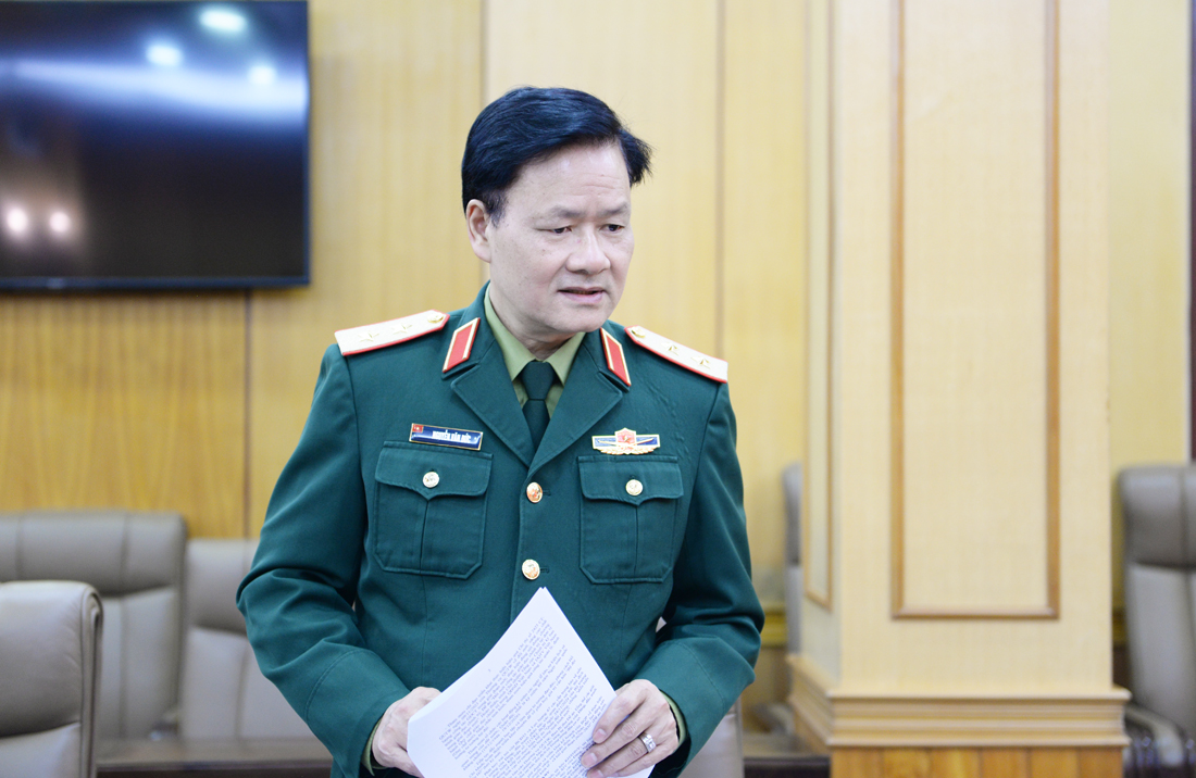 Trung tướng Nguyễn Văn Đức, Cục trưởng Cục Tuyên huấn trình bày báo cáo tại buổi làm việc.