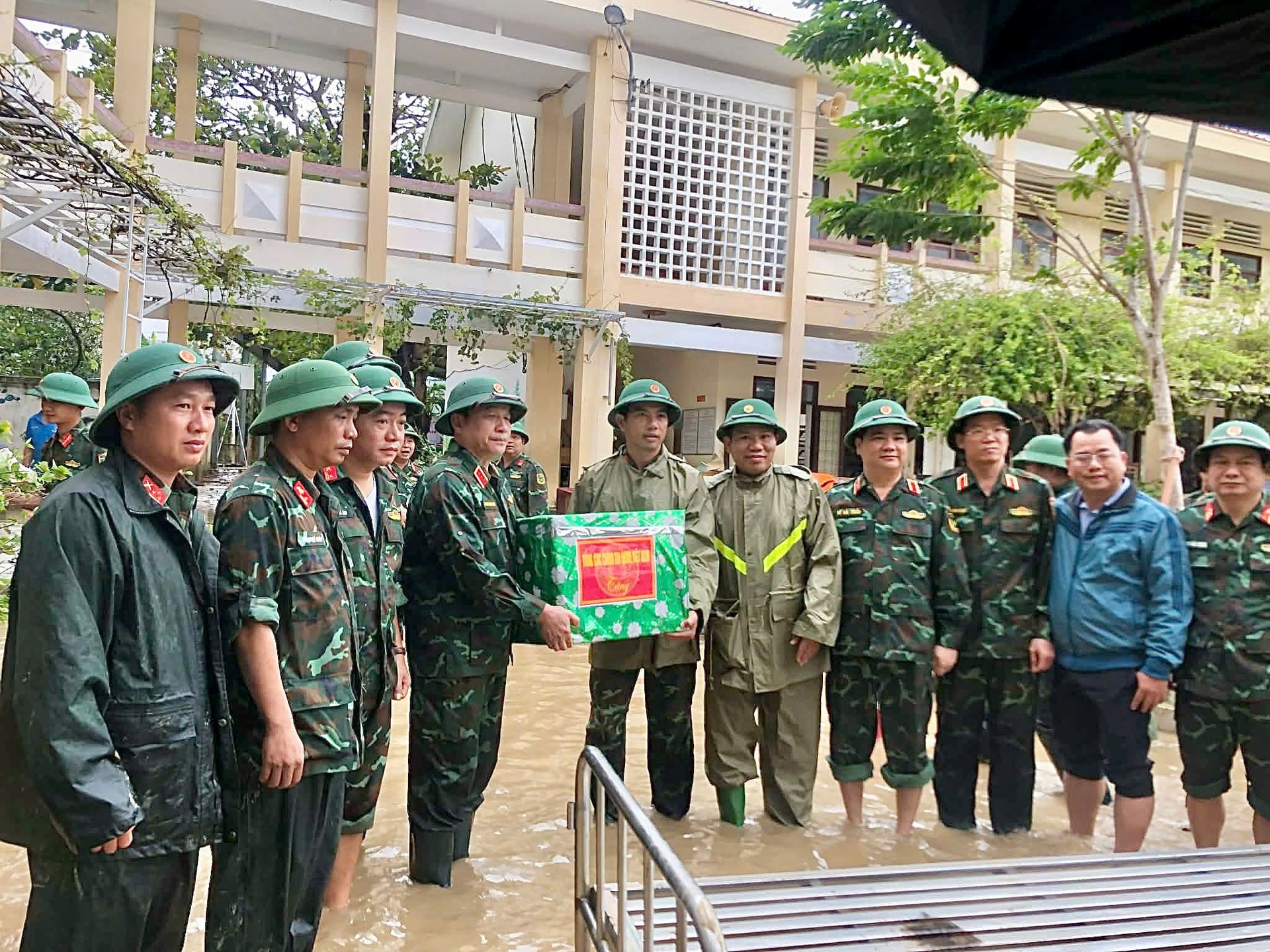 Thượng tướng Trương Thiên Tô, Phó chủ nhiệm Tổng Cục Chính trị và Đoàn công tác thăm, tặng quà, động viên cán bộ, chiến sĩ Lữ đoàn 368 thực hiện nhiệm vụ trong mưa lũ.