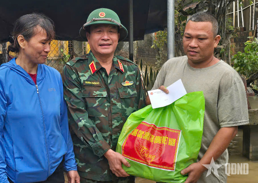 Tận tay trao những phần quà đến người dân, Thượng tướng Trương Thiên Tô mong muốn bà con nỗ lực, kiên cường, đoàn kết vượt qua những ngày tháng khó khăn này. Những phần quà giá trị chưa nhiều nhưng là tình cảm của Quân ủy Trung ương, Bộ Quốc phòng, Tổng cục Chính trị QĐND Việt Nam gửi đến bà con vùng lũ.