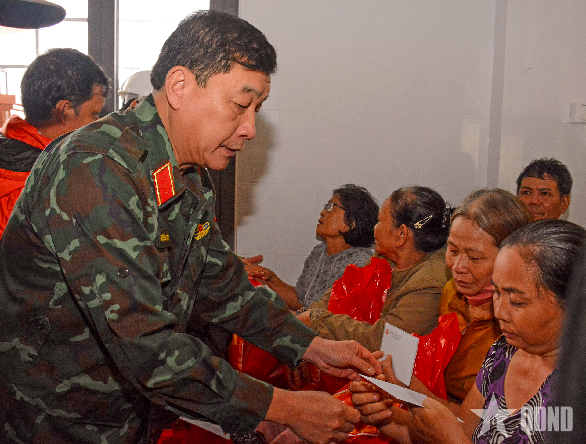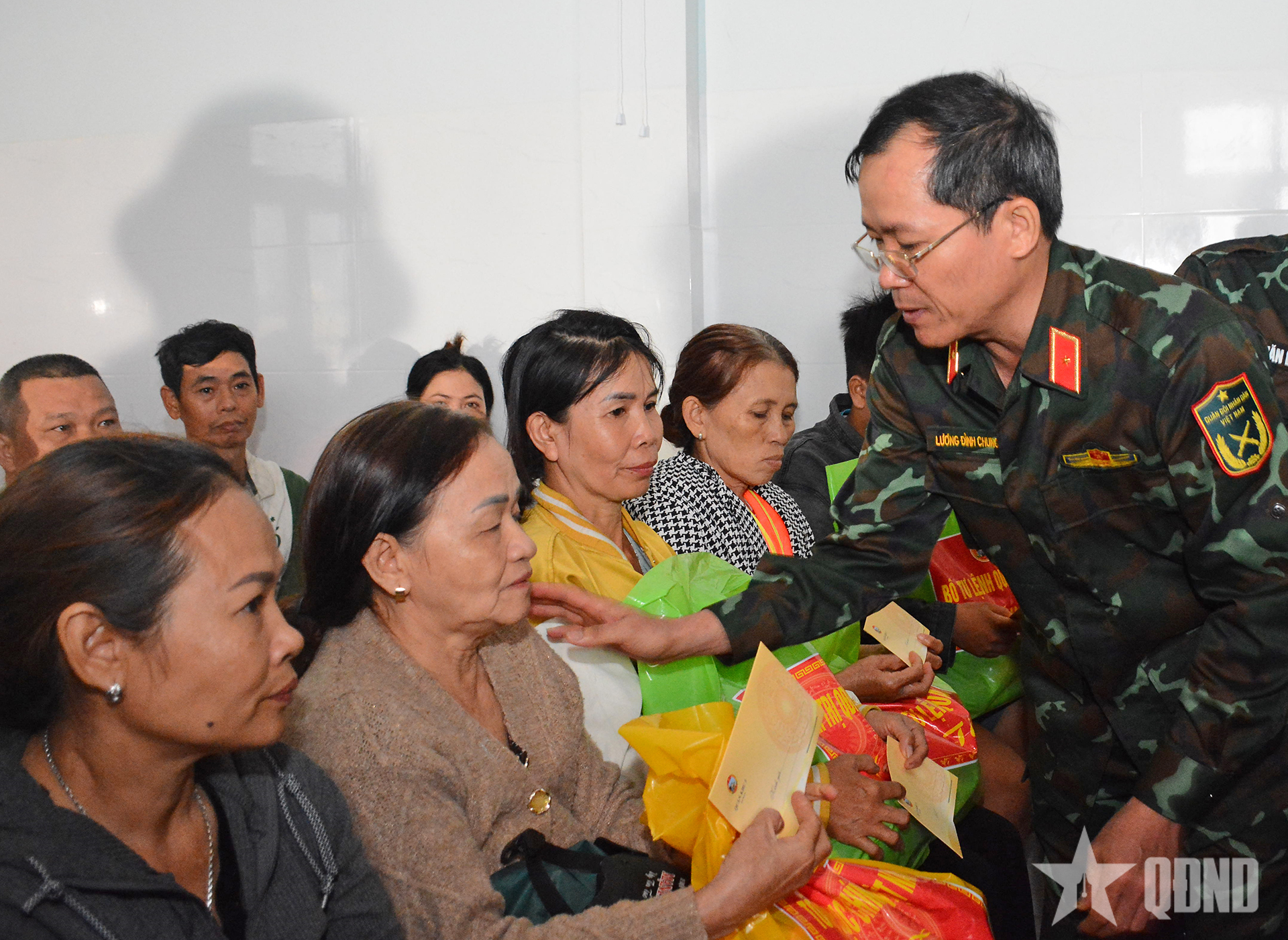 Thiếu tướng Lương Đình Chung, Bí thư Đảng ủy, Chính ủy Quân khu 5 trao quà tặng người dân.