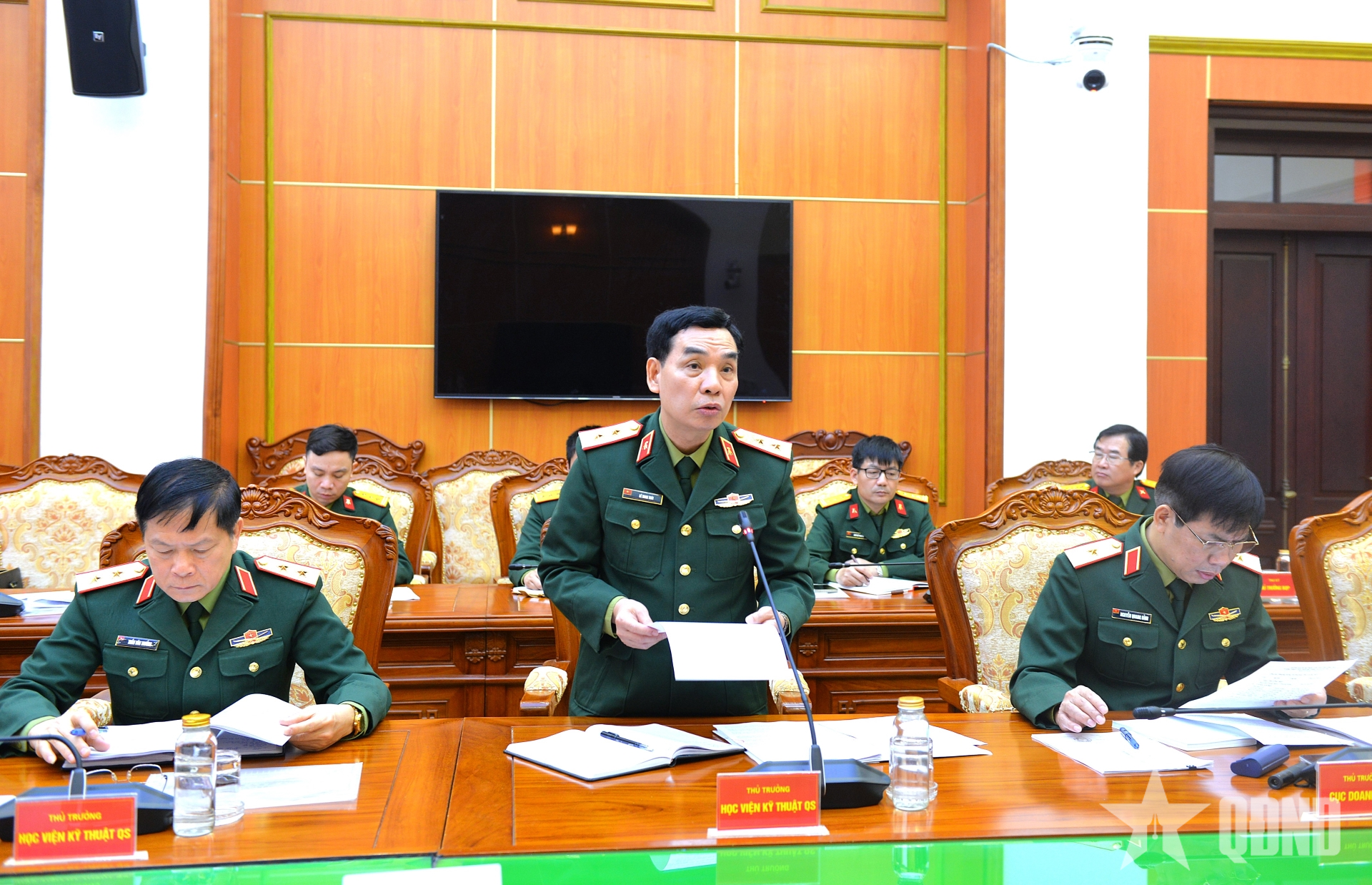 Trung tướng Lê Minh Thái, Giám đốc Học viện Kỹ thuật Quân sự phát biểu tại hội nghị.