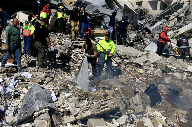 Lực lượng cứu hộ tìm kiếm các nạn nhân tại hiện trường đổ nát sau vụ không kích của Israel xuống thành phố Sidon, miền Nam Liban, ngày 8/4/2026. Ảnh: THX/TTXVN