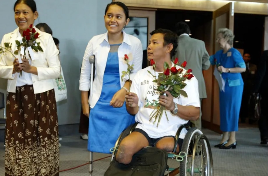 Nạn nhân bom mìn tại một cuộc họp của đại biểu đến từ các quốc gia ký kết công ước Ottawa. Ảnh: Barbara Walton