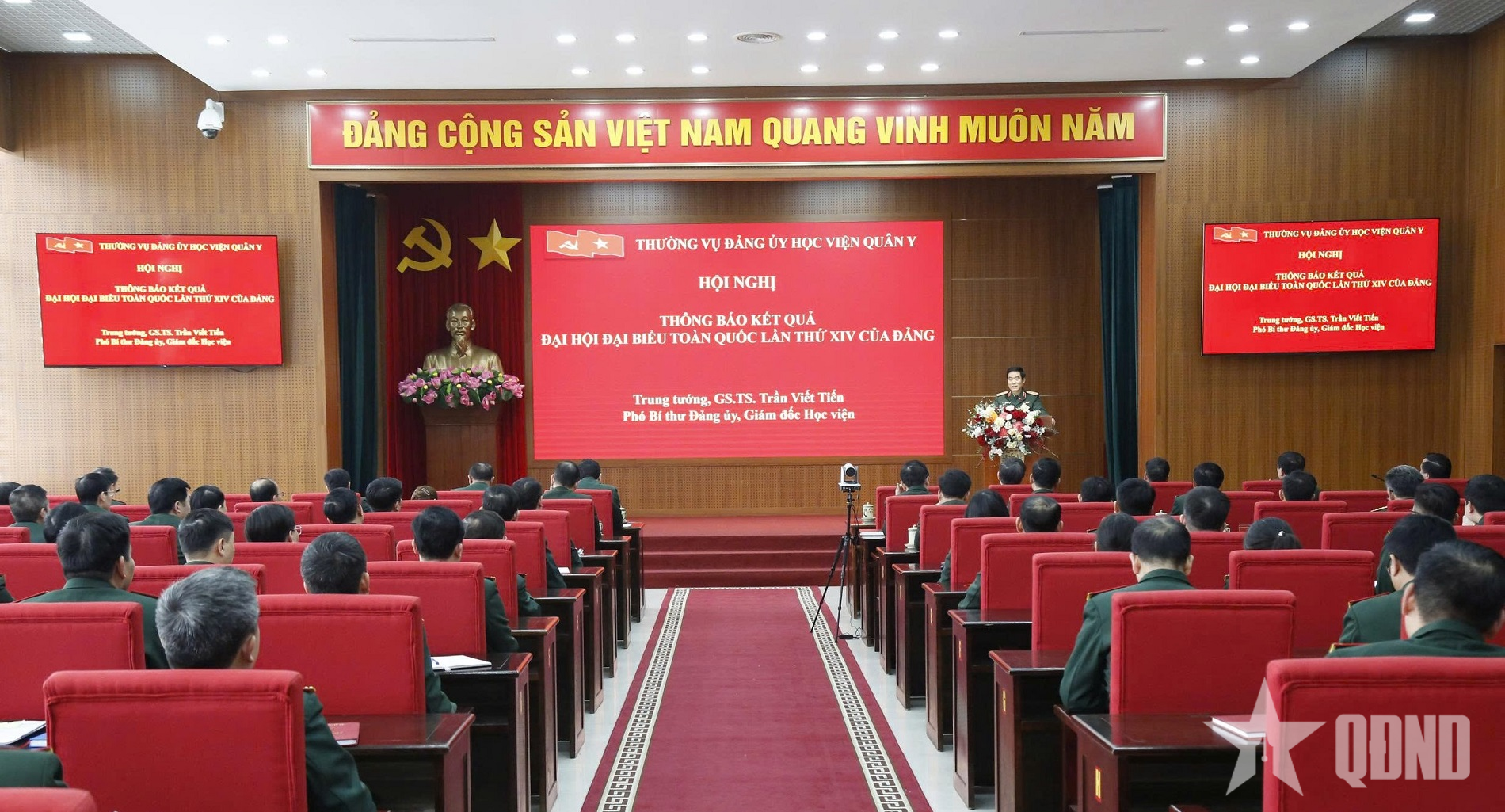 Phát biểu kết luận hội nghị, Trung tướng, GS, TS Trần Viết Tiến nhấn mạnh, Đại hội XIV của Đảng thành công rất tốt đẹp thể hiện niềm tin, ý chí, quyết tâm và tầm nhìn phát triển mới của Đảng và dân tộc ta. Đây là tiền đề vững chắc để toàn Đảng, toàn dân, toàn quân tự chủ chiến lược, tự tin, tự cường, tiến mạnh trong kỷ nguyên mới. Chính vì vậy, đề nghị các cơ quan đơn vị tổ chức thông báo kết quả Đại hội XIV của Đảng nghiêm túc, chặt chẽ. Đồng chí bí thư cấp ủy các cơ quan, đơn vị trực tiếp thông báo tới 100% cán bộ, đảng viên, quần chúng trong đơn vị; qua đó tạo sự thống nhất cao về nhận thức tư tưởng, hành động của cán bộ, đảng viên và quần chúng trong Học viện, củng cố niềm tin, quyết tâm hoàn thành xuất sắc mọi nhiệm vụ được giao, nhất là mục tiêu, nhiệm vụ Đại hội XIV của Đảng đề ra, góp phần nâng cao chất lượng đào tạo, nghiên cứu khoa học và điều trị của Học viện Quân y.