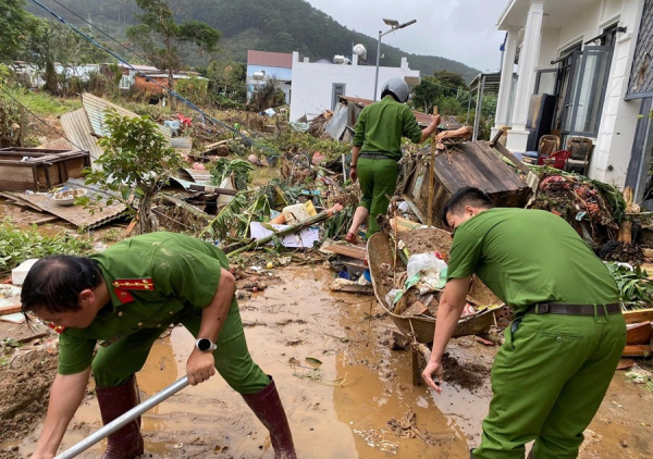 Lực lượng Công an các đơn vị, địa phương tỉnh Lâm Đồng hỗ trợ nhân dân vùng lũ khắc phục hậu quả.