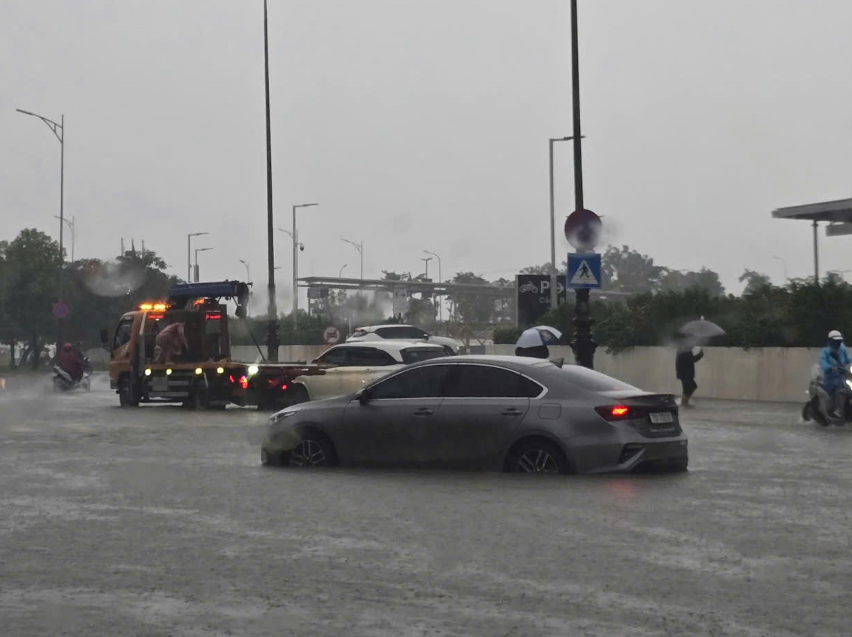Nhiều ô tô đi qua đoạn đường bị ngập gần Trung tâm Thương mại AEON MALL Huế bị chết máy, phải gọi cứu hộ
