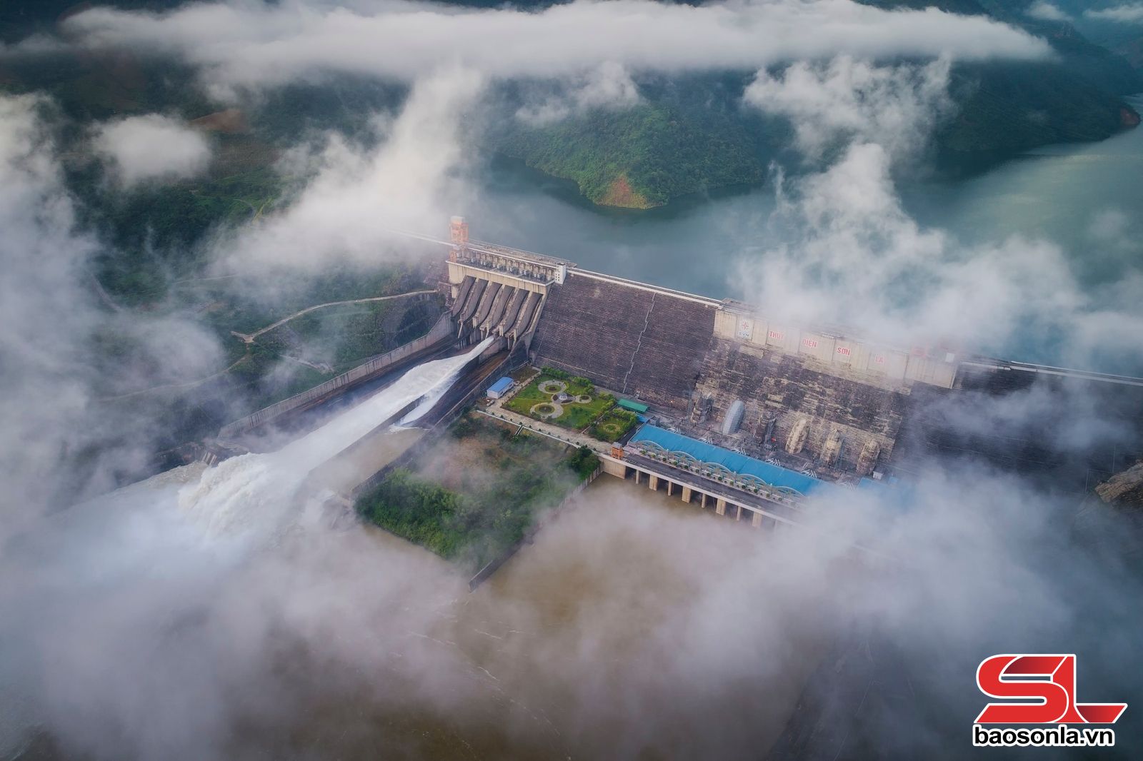 16 giờ chiều 6/10, Thủy điện Sơn La mở 1 cửa xả đáy. Ảnh: PV