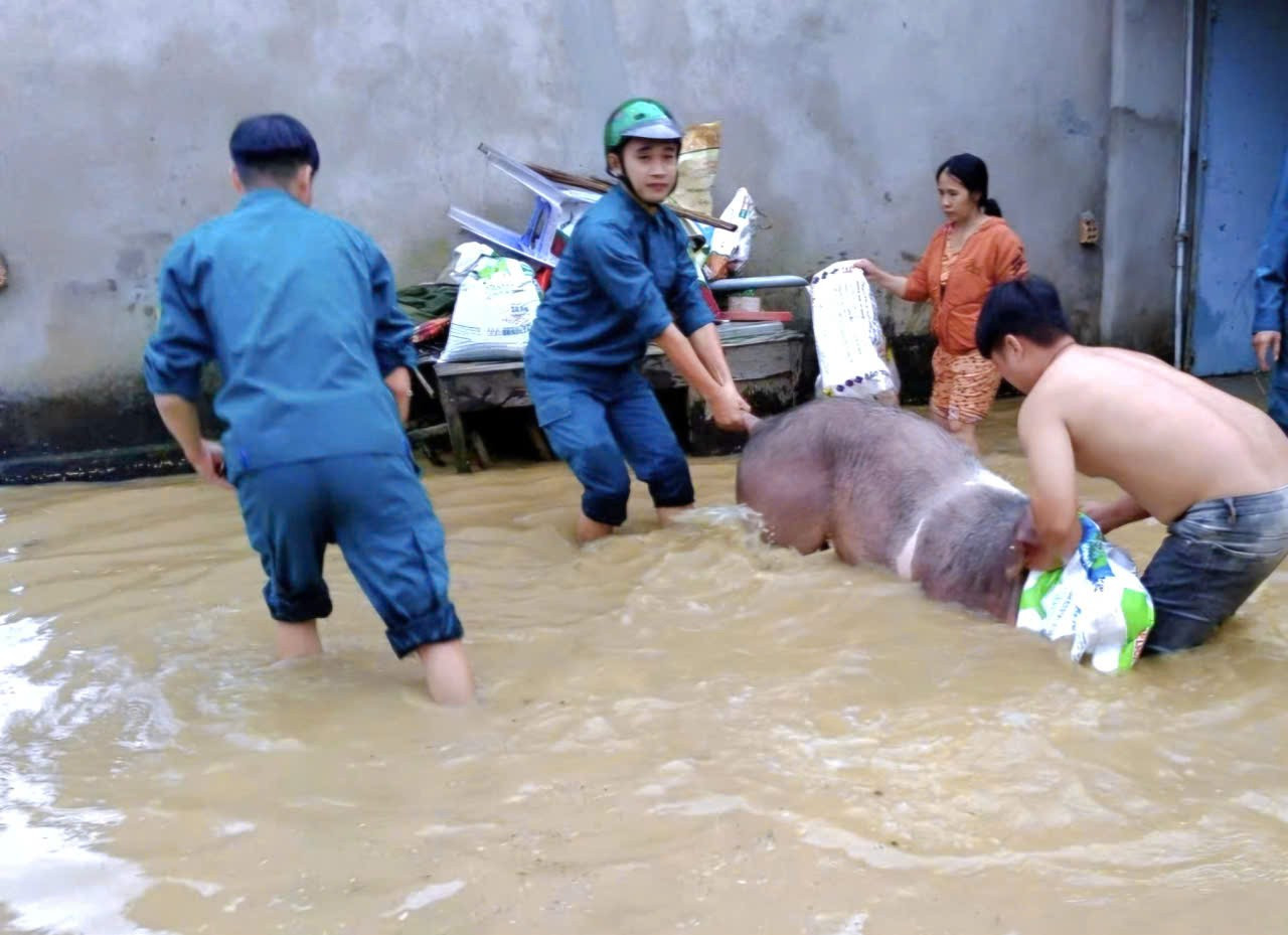 Lực lượng chức năng tại địa phương hỗ trợ người dân di dời vật nuôi