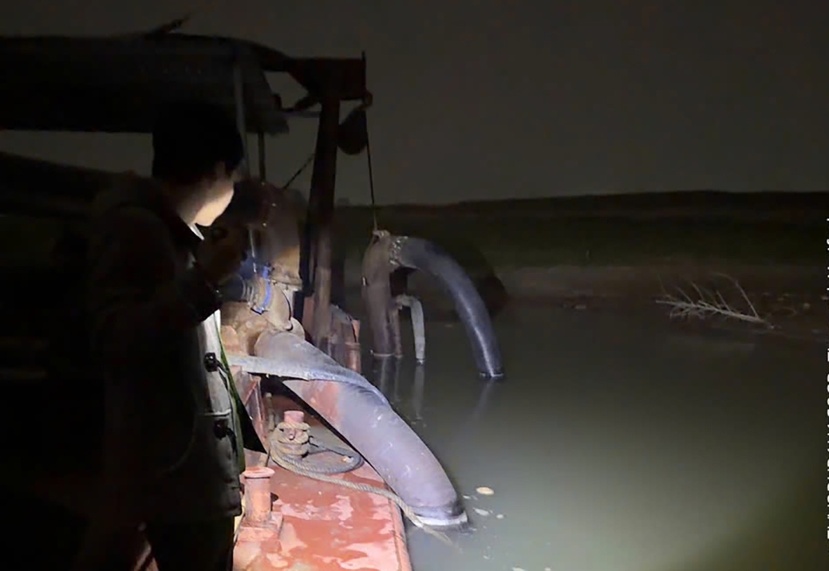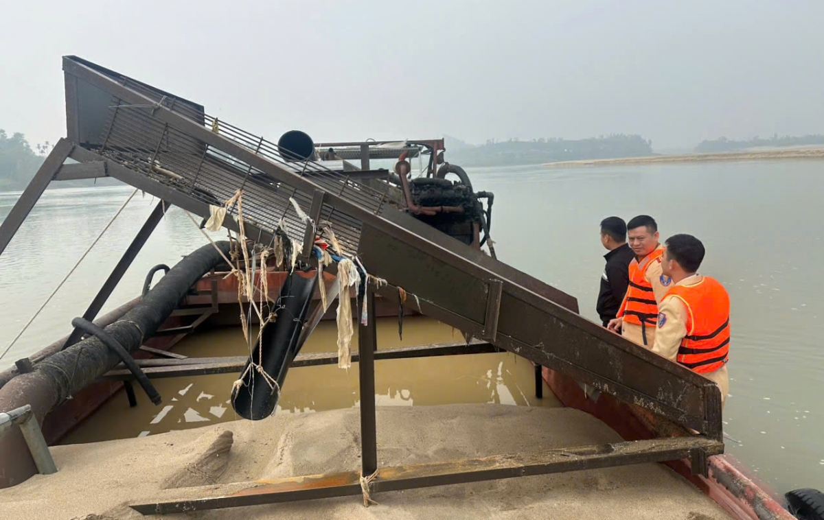 Tiếp đó, đến khoảng 3h5 phút cùng ngày, lực lượng chức năng phát hiện một phương tiện thủy có dấu hiệu khai thác khoáng sản ngoài khu vực mỏ trên sông Lam, đoạn qua xã Vạn An, tỉnh Nghệ An. Đội Cảnh sát đường thủy, Phòng CSGT Công an tỉnh Nghệ An chủ trì, phối hợp với Thủy đoàn I và Công an xã Vạn An tiến hành kiểm tra, phát hiện phương tiện vỏ sắt gắn số đăng ký TH-0671, lắp đặt thiết bị hút cát, do Nguyễn Văn T. (SN 1991, trú tại xã Vạn An) trực tiếp vận hành. Quá trình làm việc, đối tượng không xuất trình được các giấy tờ hợp pháp liên quan đến hoạt động khai thác cát. Tổ công tác đã yêu cầu dừng ngay hoạt động hút cát, neo phương tiện tại chỗ để phục vụ công tác xác minh, xử lý.
