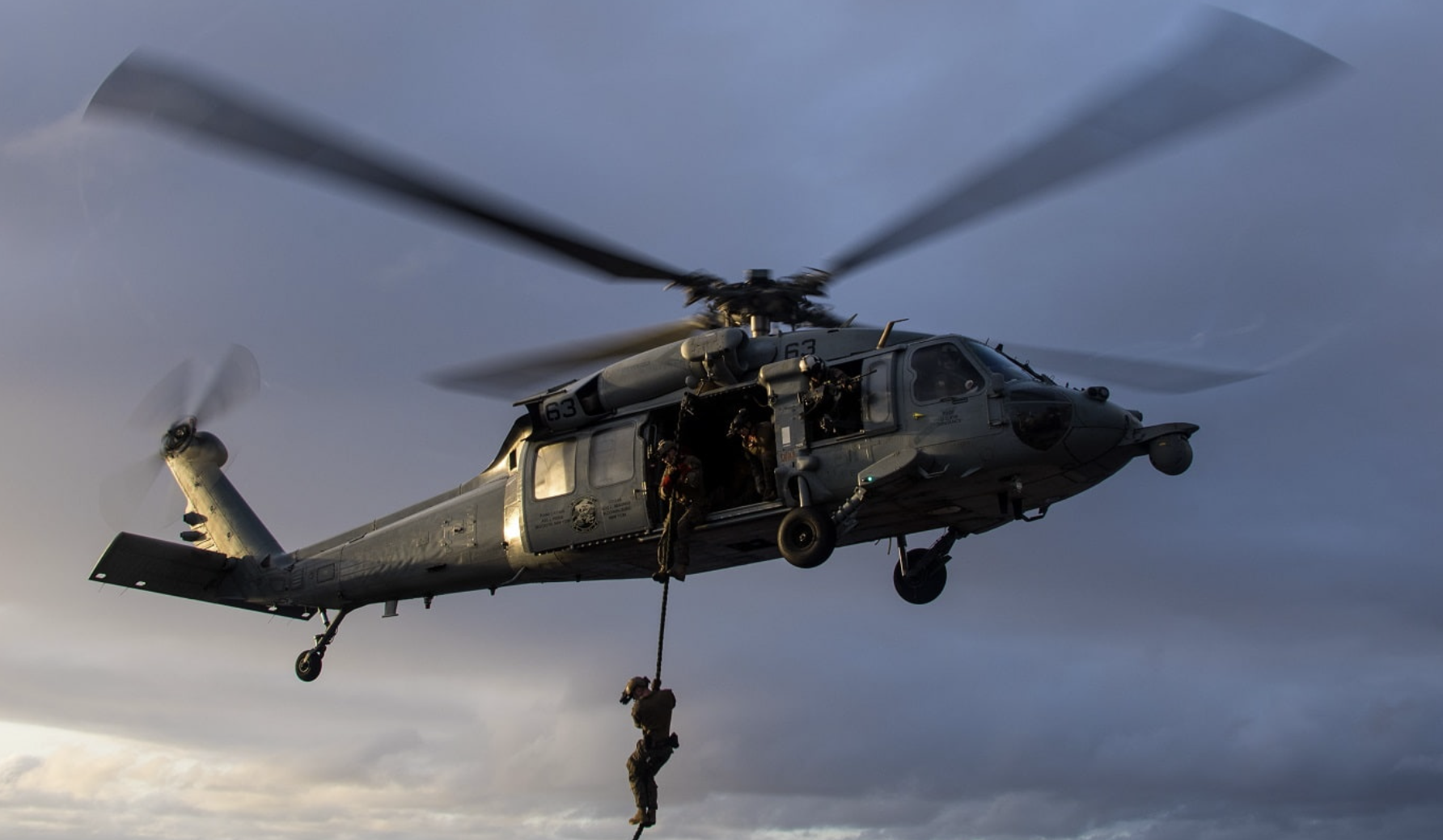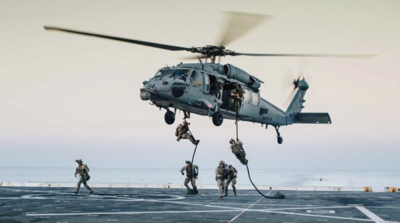 Các binh sĩ luyện tập đu dây từ trực thăng MH‑60S Sea Hawk xuống tàu USS Iwo Jima, thể hiện khả năng đổ bộ nhanh và hiệu quả