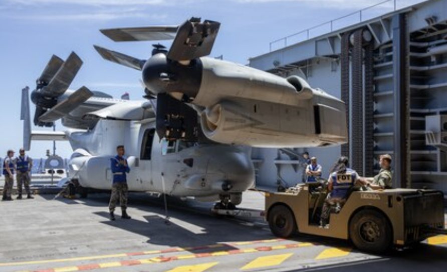 Theo thông tin được công bố, Thủy quân lục chiến Mỹ đã triển khai máy bay nghiêng cánh vận tải - đột kích MV-22B Osprey từ tàu đổ bộ tấn công USS Boxer trong khuôn khổ đội hình sẵn sàng đổ bộ ARG - MEU tại khu vực Ấn Độ - Thái Bình Dương.