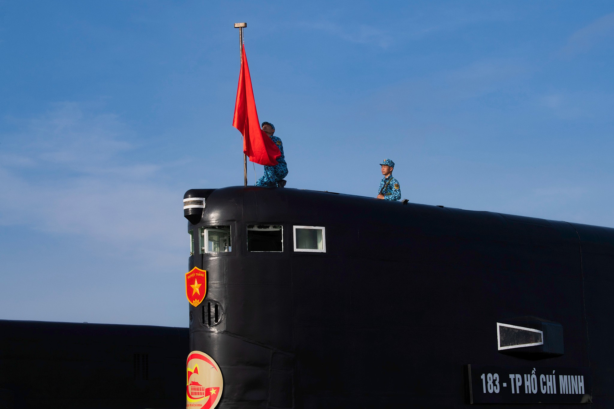Bay cao cờ Tổ quốc. Hình ảnh người chiến sĩ trang nghiêm hôn lên lá cờ Tổ quốc trên đỉnh tháp tàu ngầm là biểu tượng bất khuất của ý chí, niềm tự hào dân tộc, khẳng định trách nhiệm kế thừa, phát huy truyền thống hào hùng của các thế hệ cha anh trong sự nghiệp bảo vệ chủ quyền biển đảo của Tổ quốc thân yêu.