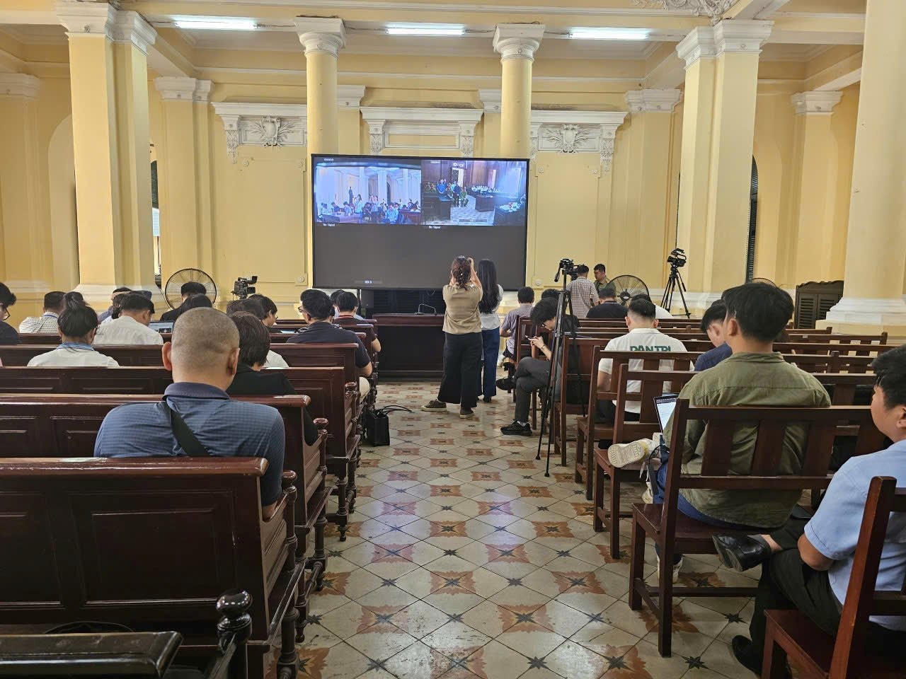 PV báo chí tác nghiệp qua màn hình tại phiên tòa.