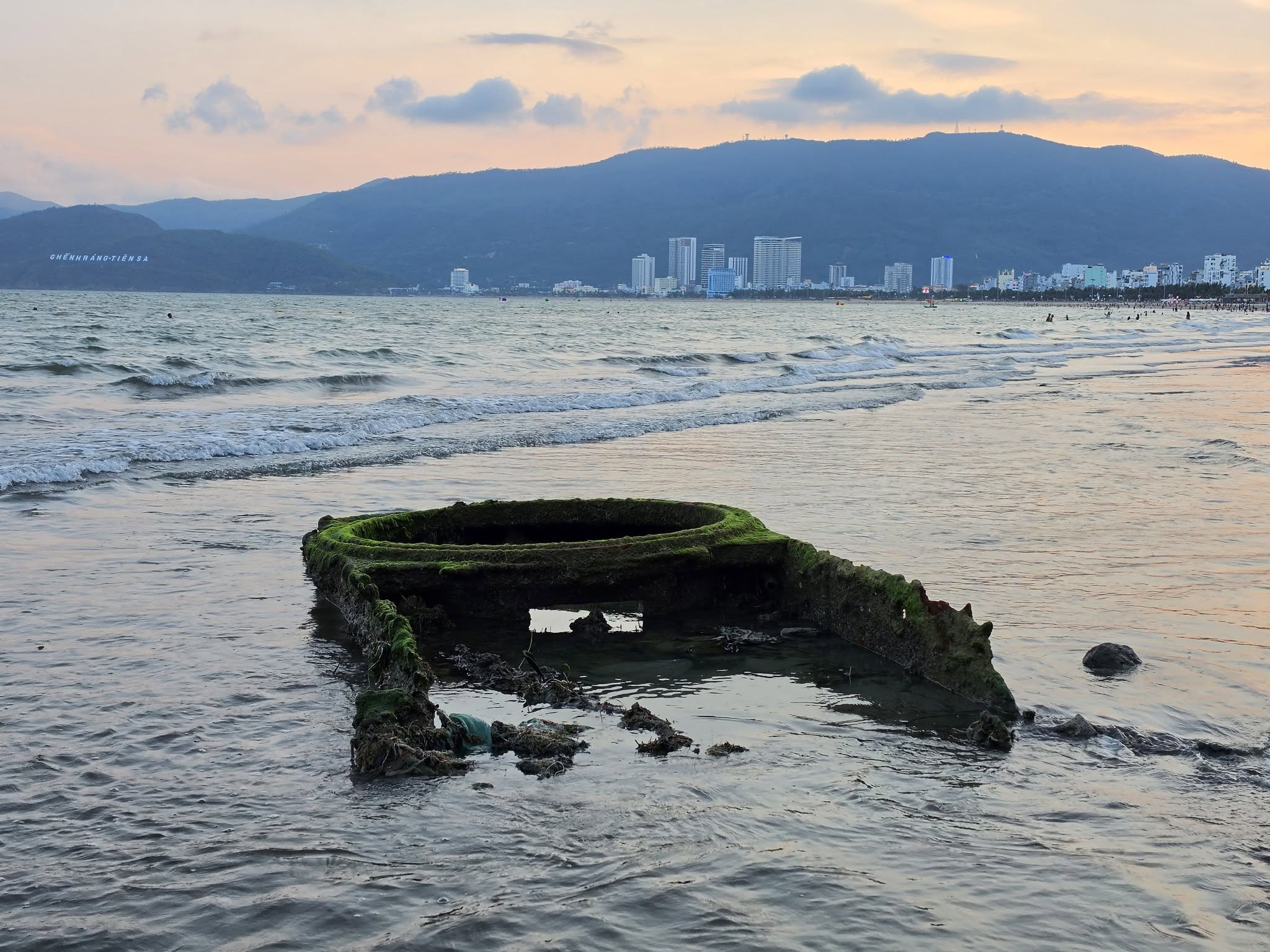 Vật thể nghi là chiếc xe tăng cũ tại bờ biển Quy Nhơn. Ảnh: Lương Quốc Cường