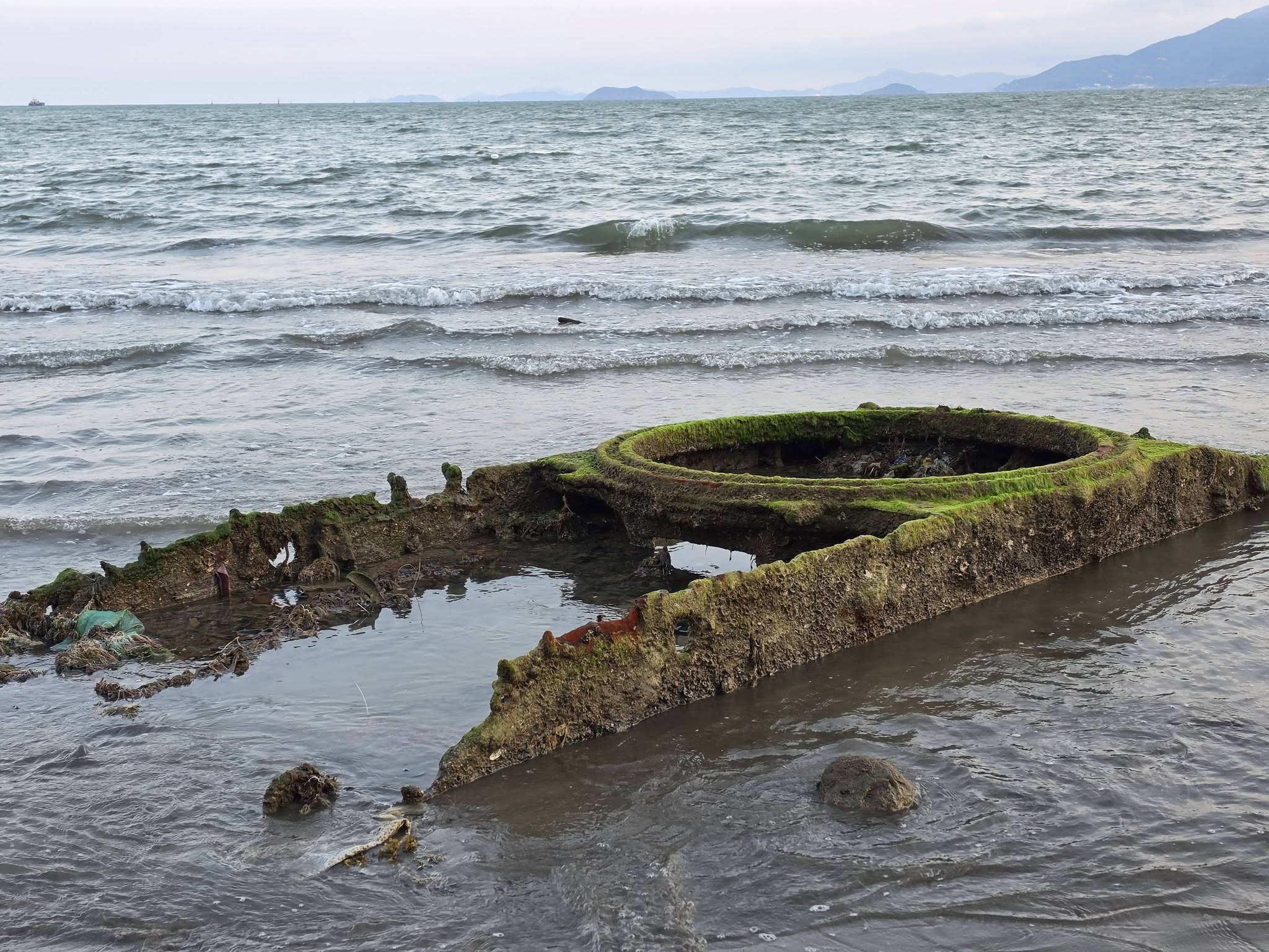 Thủy triều rút sâu lộ ra phần thân nghi là xe tăng cũ. Ảnh: Lương Quốc Cường