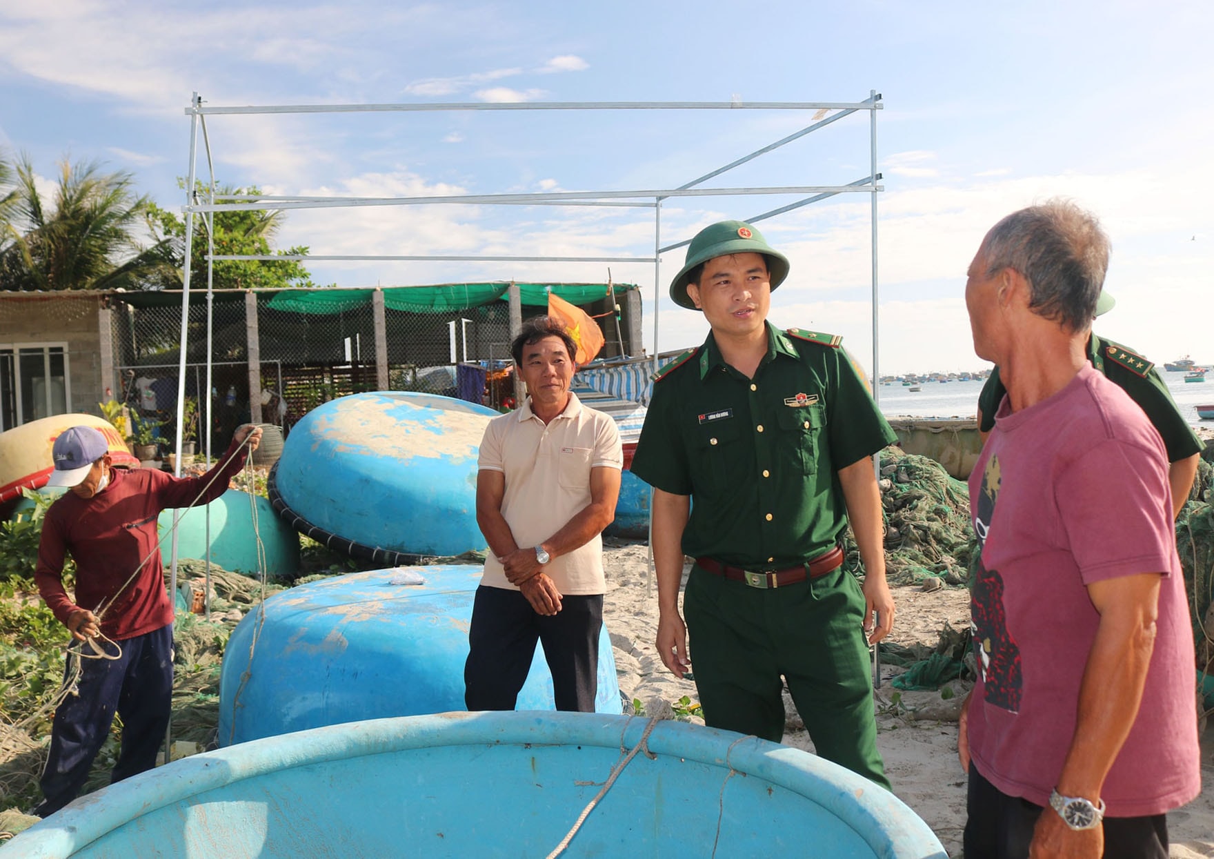 Bộ đội biên phòng nơi biên giới biển, gặp gỡ tuyên truyền bầu cử cho ngư dân bao gồm thuyền trưởng, chủ tàu cá