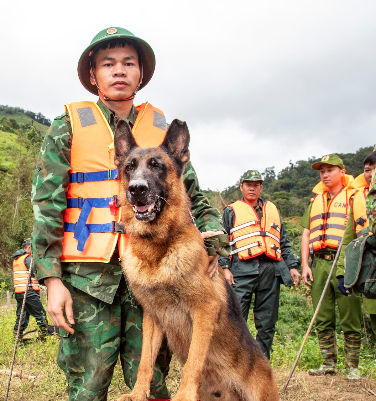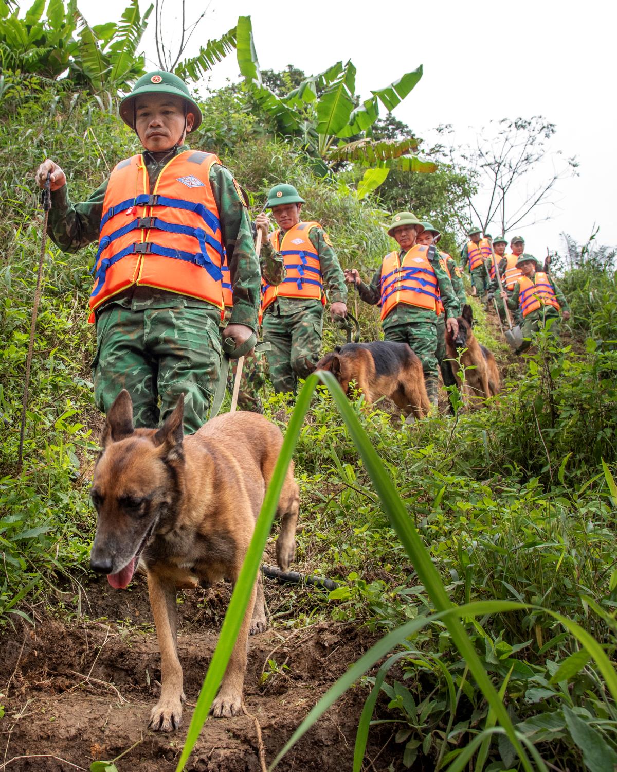 Hiện, Đội chó nghiệp vụ Trường Trung cấp 24 Biên phòng vẫn tiếp tục được đưa ra bám hiện trường. Những chú chó này càng tìm kiếm càng tỏ vẻ hăng say, sục sạo đến các vị trí đã được các thành viên sử dụng que nhọn thọc sâu khoảng 1 mét xuống lòng đất để hỗ trợ chó ngửi thấy nguồn hơi lạ.