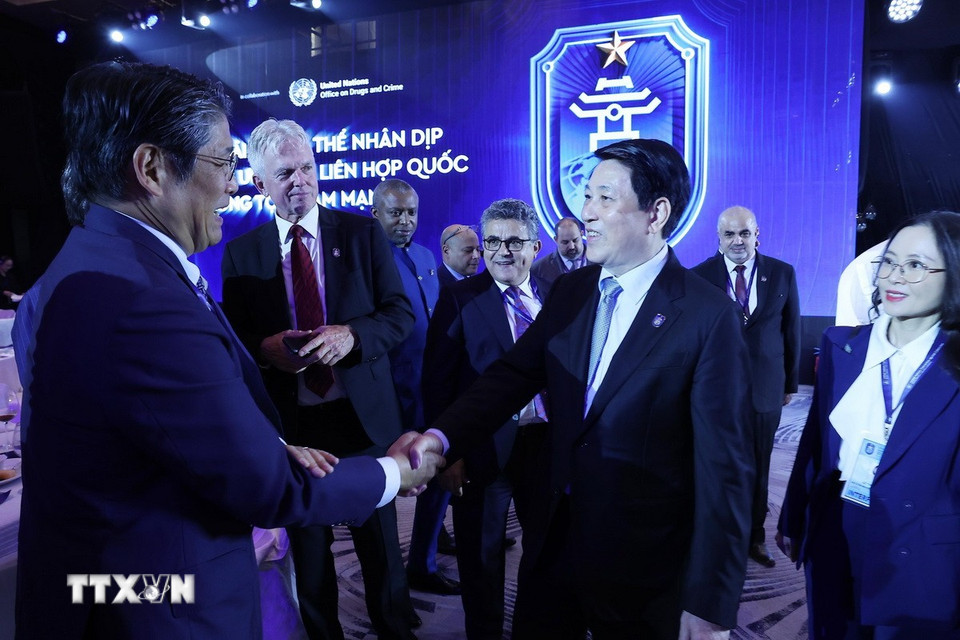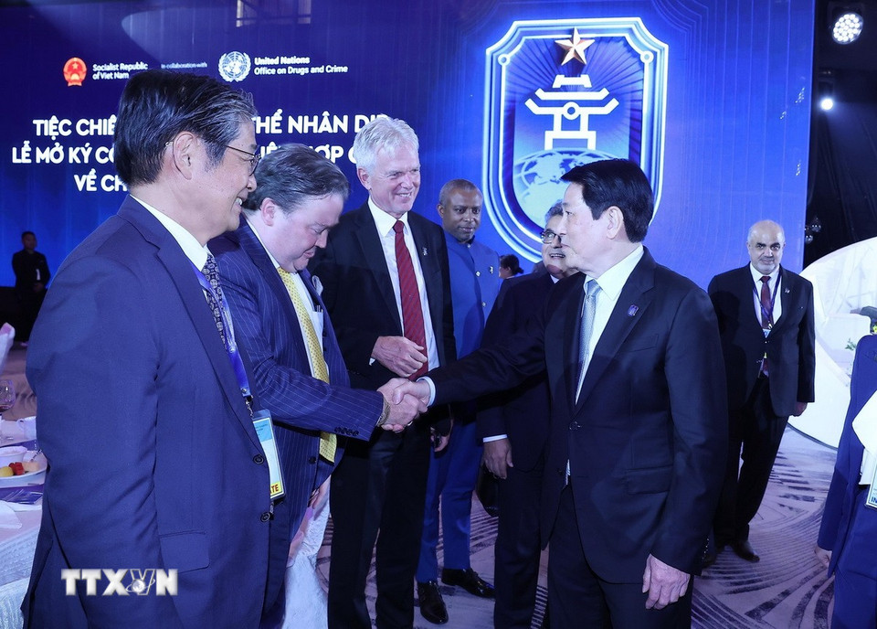 Chủ tịch nước Lương Cường chào mừng các Trưởng đoàn tham dự Lễ mở ký Công ước Hà Nội. (Ảnh: Lâm Khánh/TTXVN)