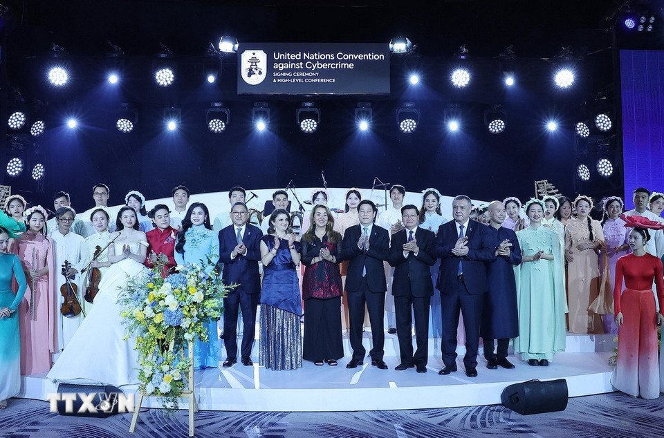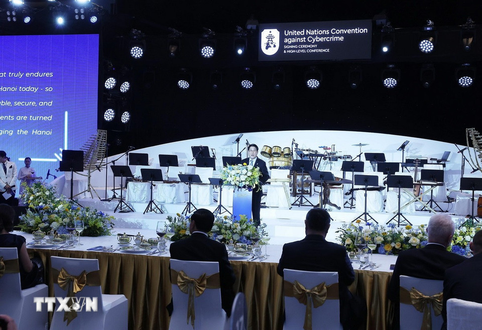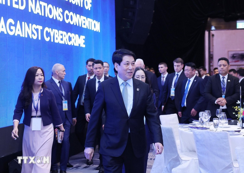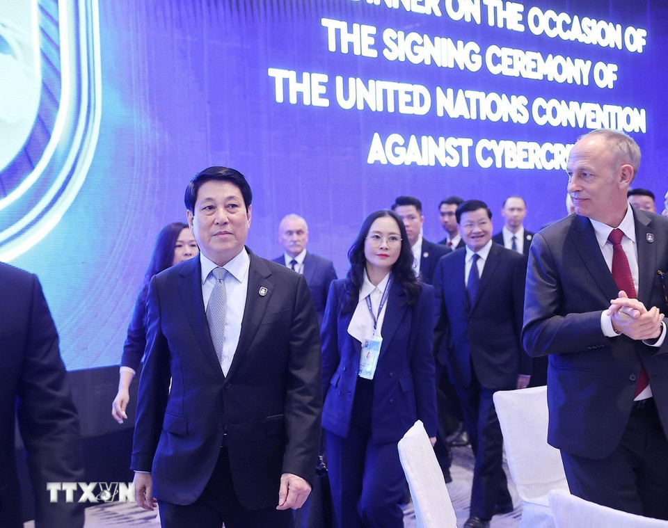 Chủ tịch nước Lương Cường phát biểu chào mừng các đoàn tham dự Lễ mở ký và Hội nghị cấp cao Công ước của Liên hợp quốc về chống tội phạm mạng (Công ước Hà Nội). (Ảnh: Lâm Khánh/TTXVN)