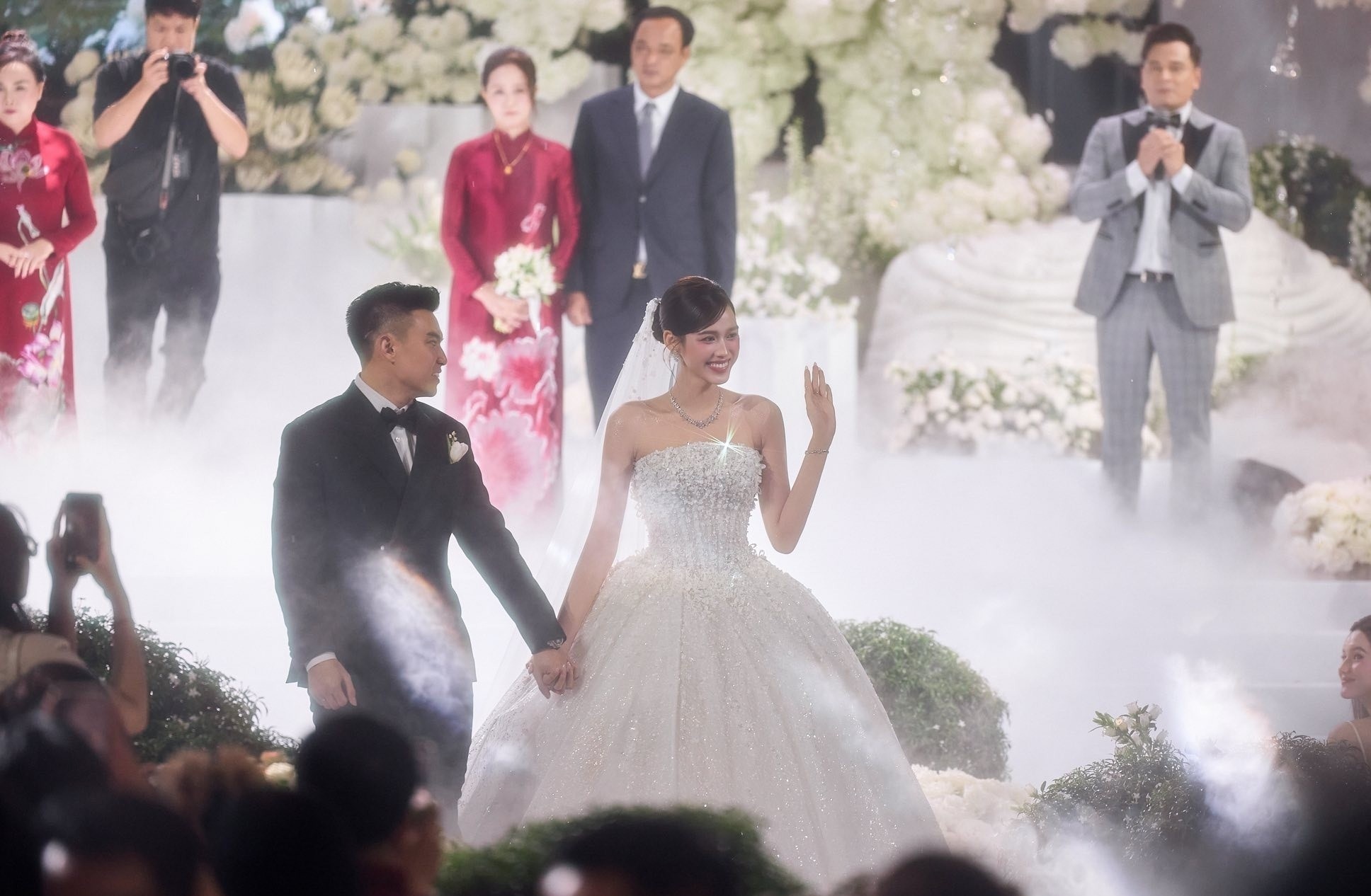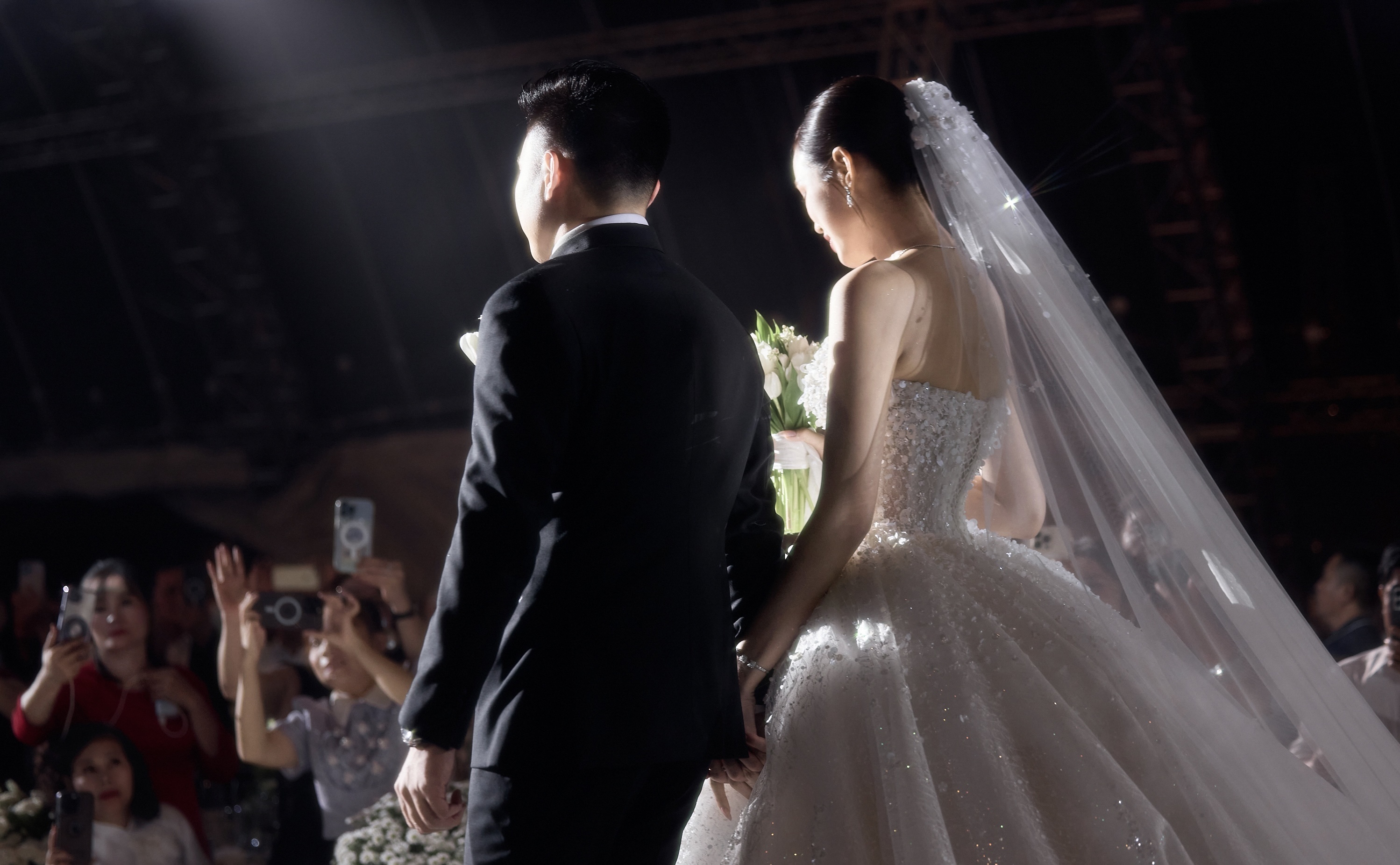 Khoảnh khắc cô dâu, chú rể trao nhẫn cưới trước sự chứng kiến của hàng nghìn quan khách. Cả hai có khoảng 2 năm yêu đương kín tiếng trước khi về chung một nhà.