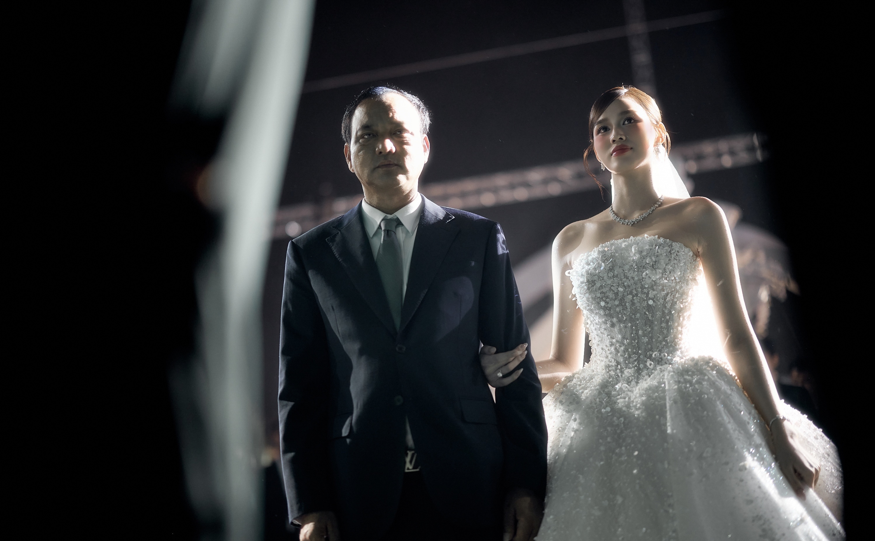 Khoảnh khắc lãng mạn của cô dâu, chú rể. Trước giờ buổi lễ diễn ra, mưa lớn khiến rạp cưới bị ảnh hưởng, công tác chuẩn bị cũng gặp khó khăn. Tuy nhiên, khách mời vẫn có mặt đông đủ để chúc mừng đôi uyên ương và gia đình hai bên.