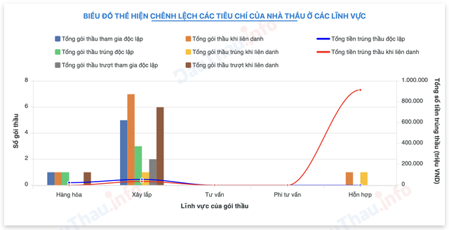 Về hình thức tham gia, công ty có xu hướng liên danh nhiều hơn so với đấu thầu độc lập. Tỷ lệ trúng thầu khi tham gia liên danh thấp hơn trong mảng xây lắp, nhưng giá trị doanh thu chủ yếu lại đến từ gói hỗn hợp theo hình thức liên danh, trong khi các gói độc lập thường có quy mô nhỏ hơn.