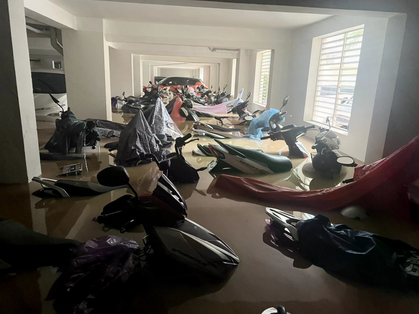 Hàng nghìn xe máy của người dân các chung cư Khu đô thị Vĩnh Điềm Trung cũng ngập trong nước.