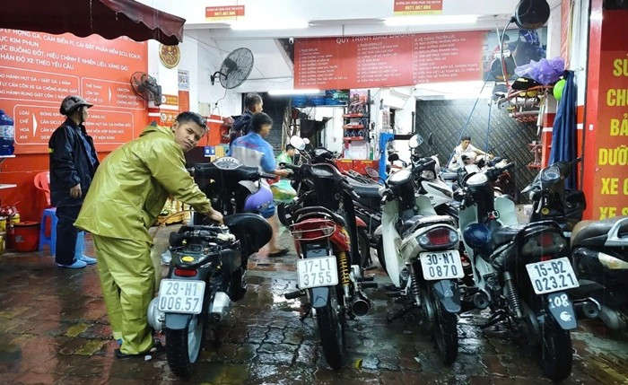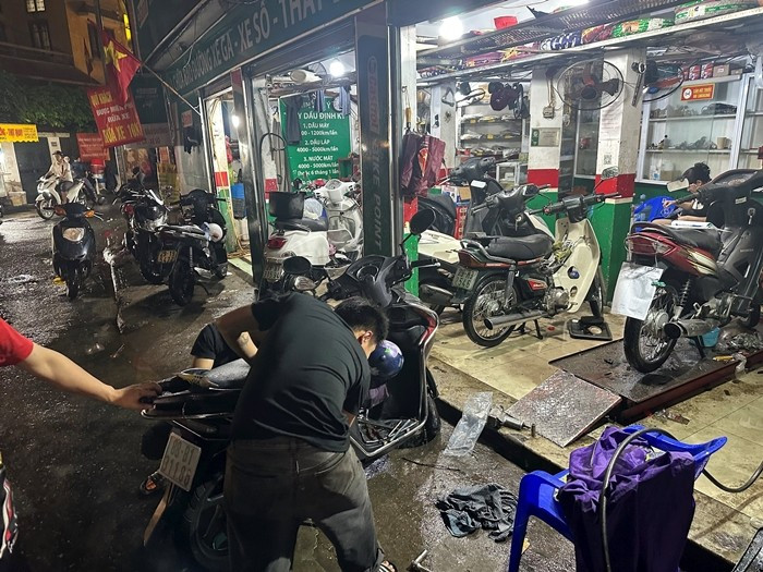 Tối cùng ngày, nhiều cửa hàng sửa xe trên các tuyến phố lớn ở Hà Nội đều ở trong tình trạng nhộn nhịp. Ảnh: VTVTimes