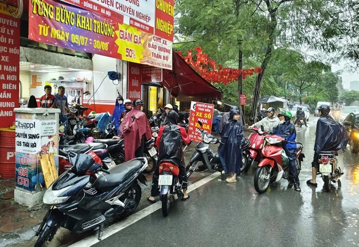 Theo một thợ sửa xe lâu năm ở phường Cầu Giấy (Hà Nội), mưa ngập là chúng tôi làm không kịp thở. Ảnh: Daibieunhandan