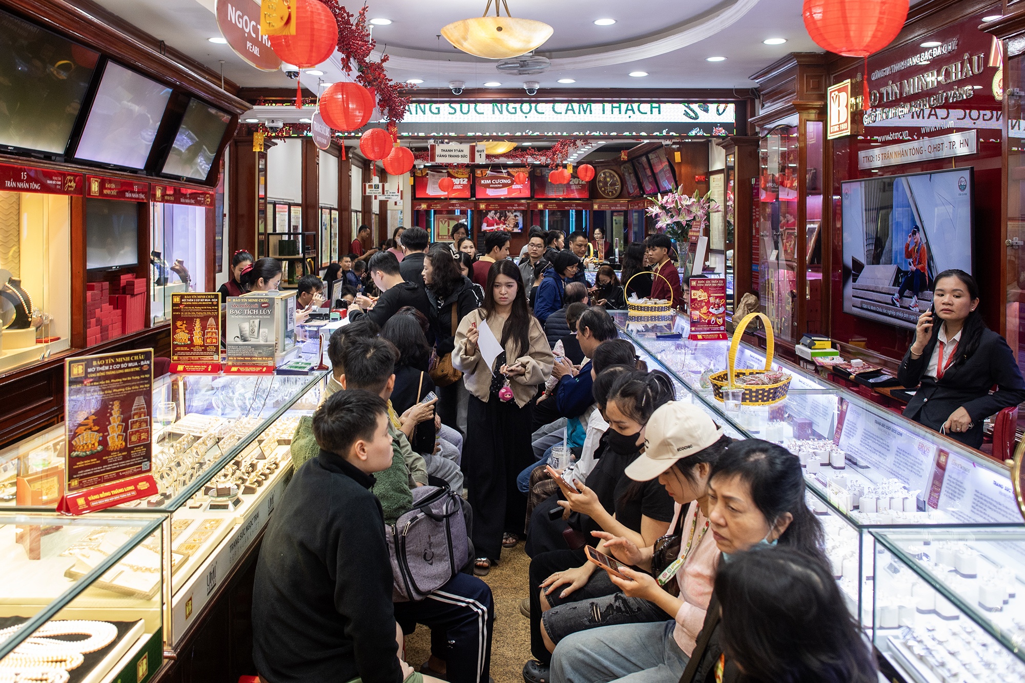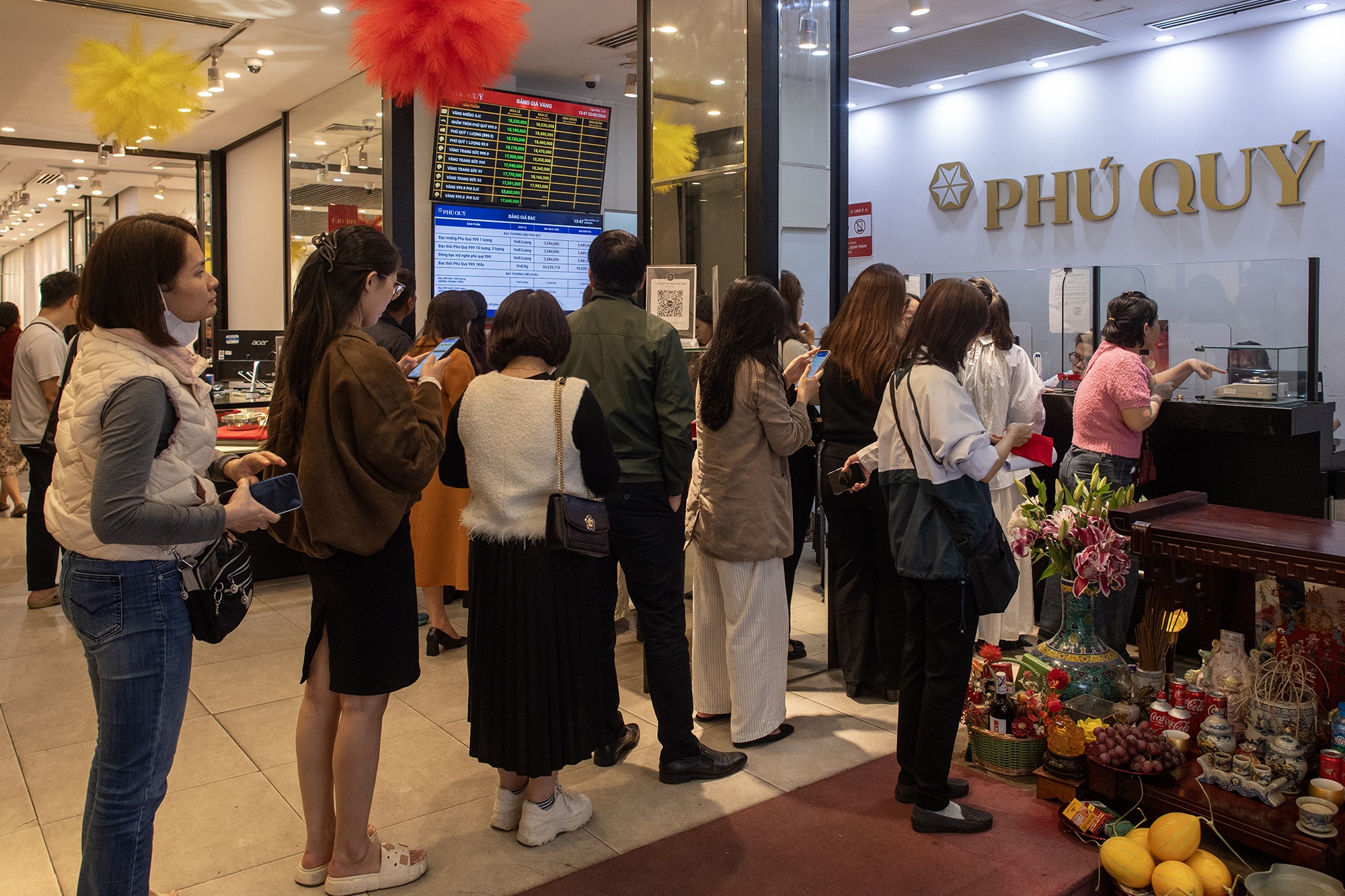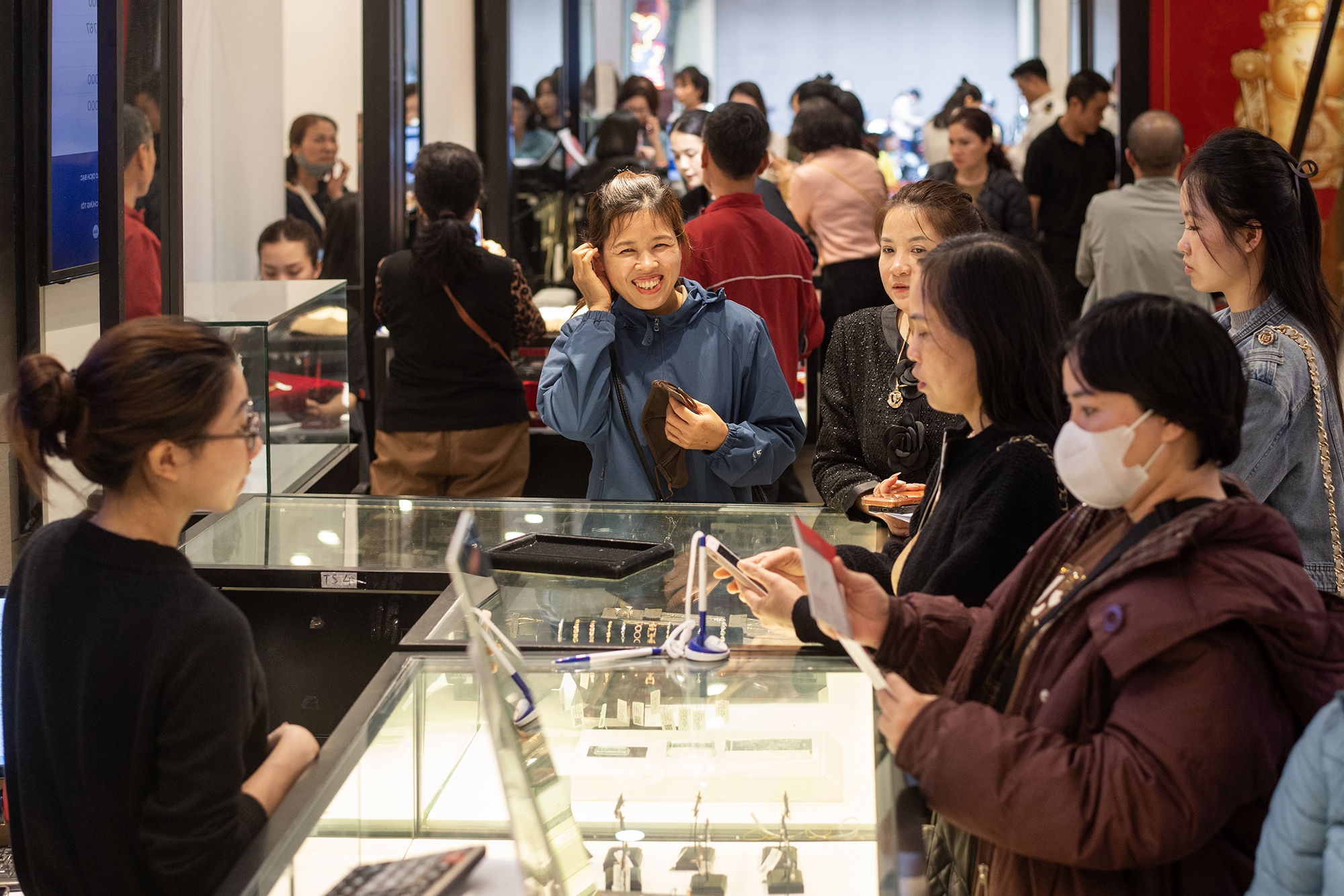 Tại một cơ sở kinh doanh vàng khác trên phố Trần Nhân Tông (Hà Nội) cũng có rất đông người dân xếp hàng chờ đến lượt mua bán, các quầy giao dịch đều kín chỗ.
