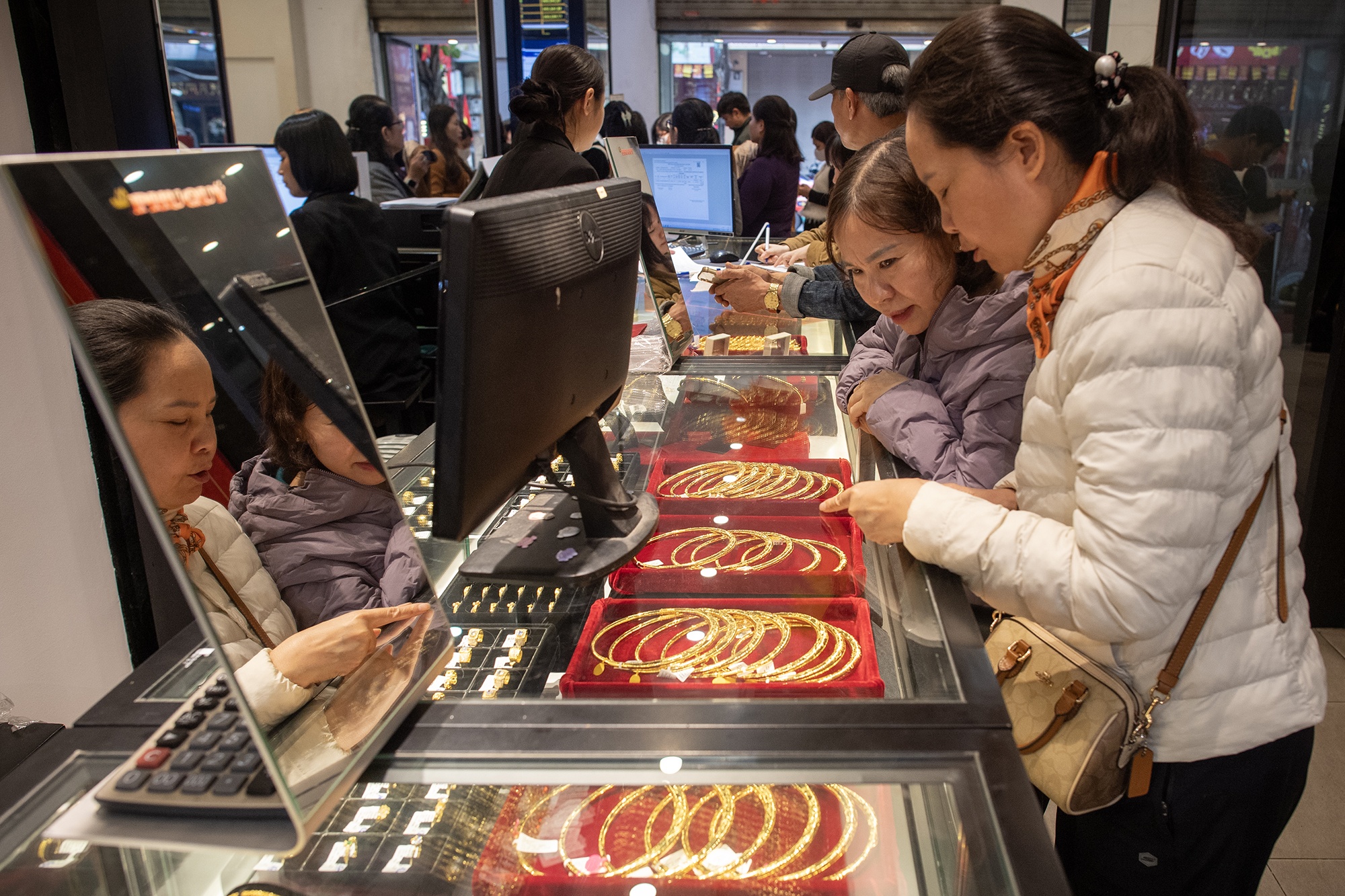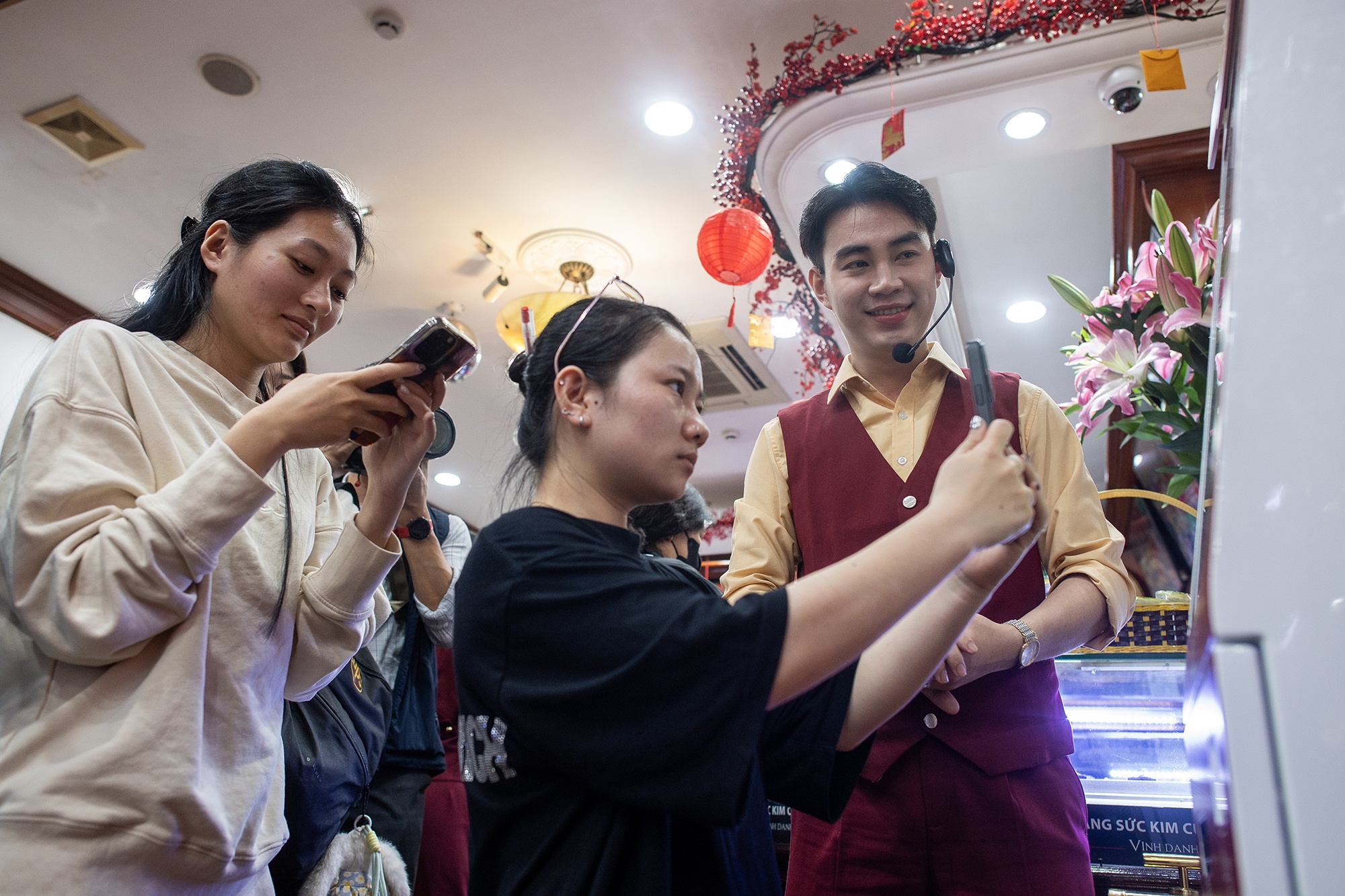 Nhân viên cửa hàng vàng làm việc hết công suất để phục vụ nhu cầu mua bán tăng cao đột biến của người dân trong dịp vía Thần Tài.