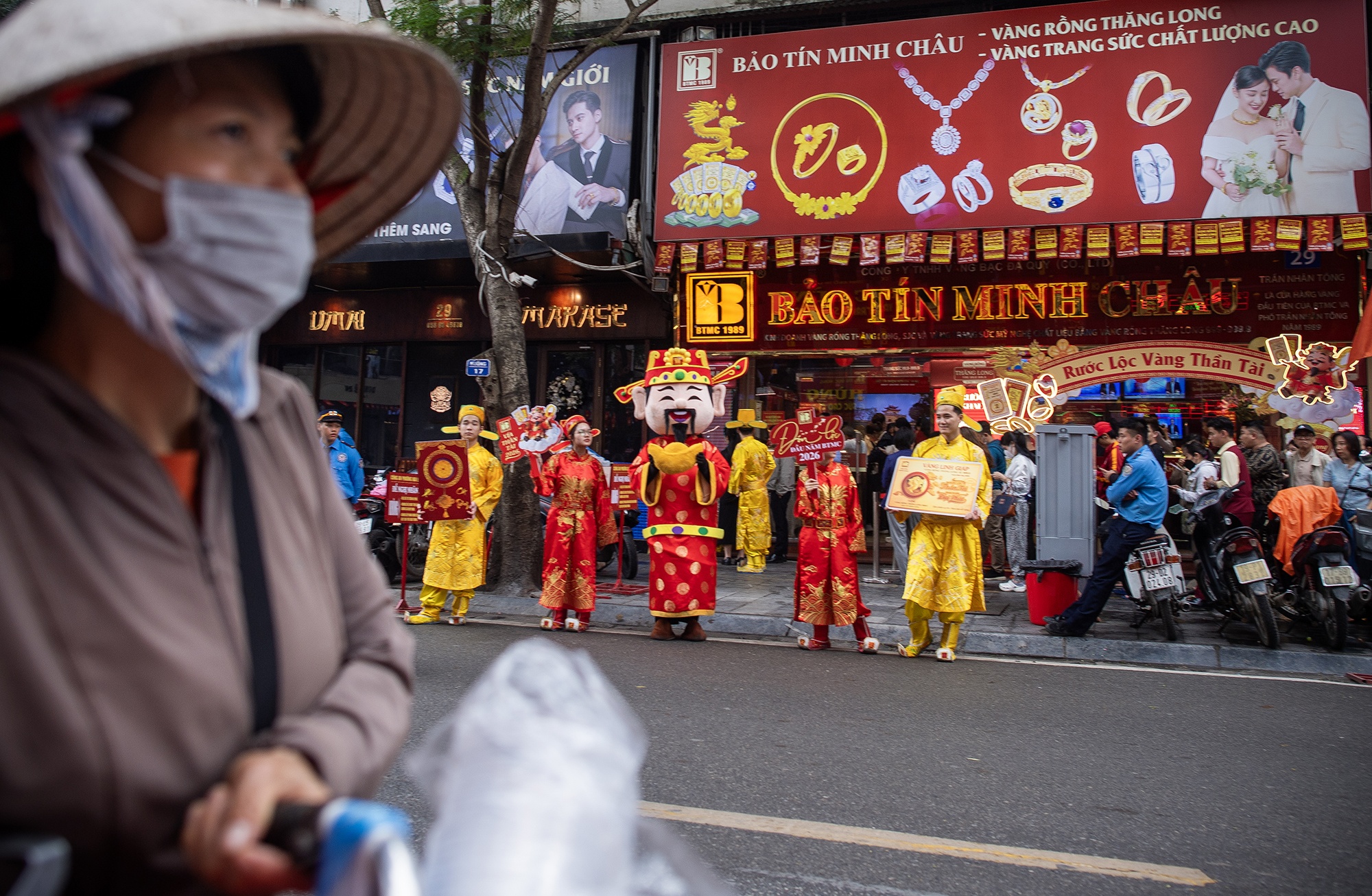 Sát ngày vía Thần Tài (10 tháng Giêng Âm lịch hàng năm), tại phố Trần Nhân Tông (Hà Nội) nhộn nhịp cảnh người người dân chờ đợi mua bán vàng lấy may dịp năm mới.