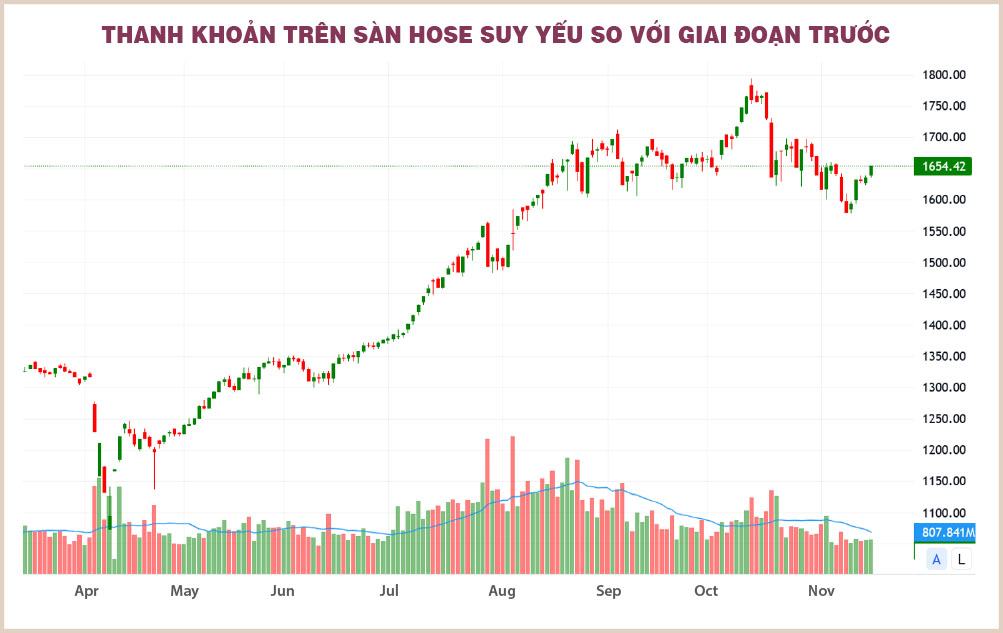 Tuy nhiên, khối lượng giao dịch không đi cùng với mức tăng của điểm số, cho thấy dòng tiền vẫn thận trọng. Cụ thể, khối lượng cổ phiếu đã trao tay trong tuần trước (từ ngày 10 đến 14-11) trên sàn HOSE là 3,21 tỉ cổ phiếu, chỉ bằng 54% khối lượng giao dịch bình quân tuần trong 20 tuần gần nhất là gần 5,93 tỉ cổ phiếu và giảm hơn 21% so với tuần trước đó. Thanh khoản trong nửa đầu tháng 11 giảm 29% so với mức bình quân trong tháng 10.