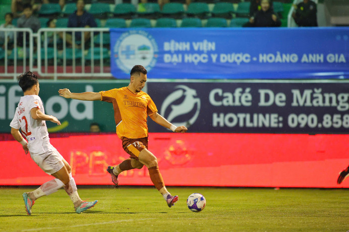 Ở một góc khá hẹp, tiền đạo Việt kiều Ryan Hà có cú đá làm tung nóc lưới khung thành Thể Công Viettel. Ảnh: Linh Hùng