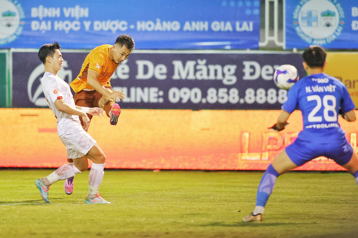 Nhiều CĐV đã ngợi khen chân sút HAGL có pha dứt điểm quá hay, bởi không nhiều tiền đạo có thể dứt điểm mạnh và hóc hiểm trong một tình huống góc khá hẹp. Ảnh: Linh Hùng