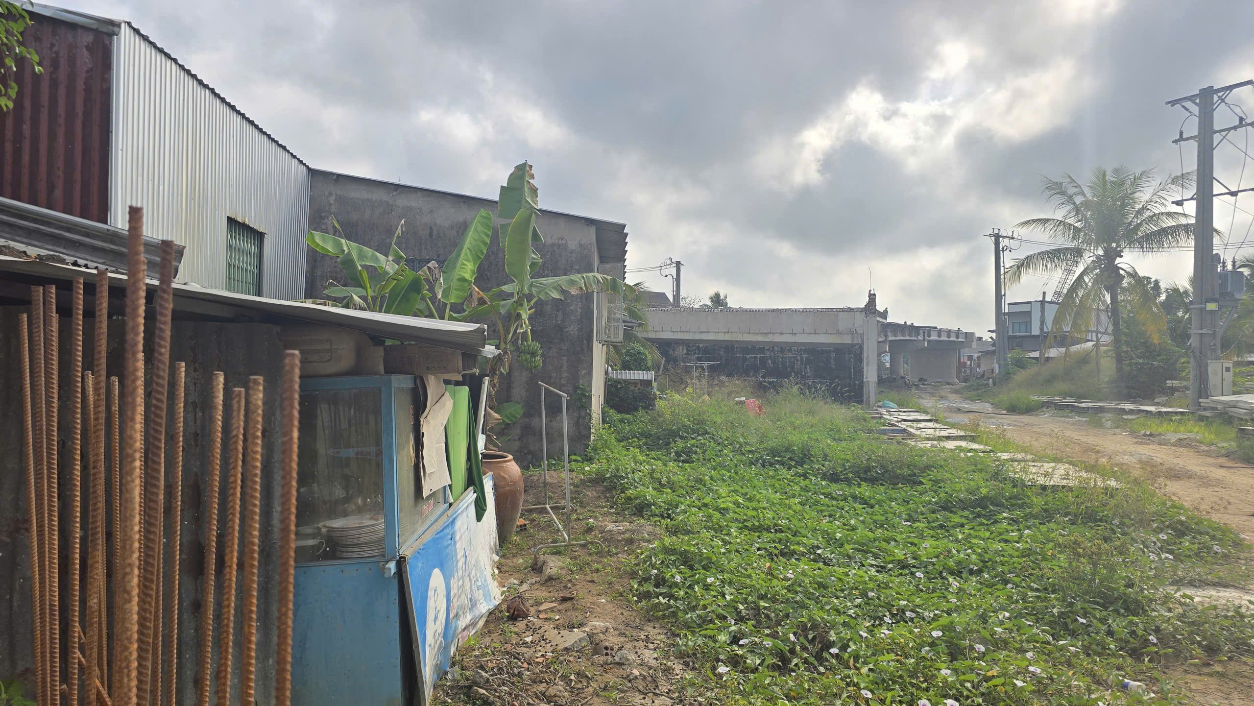 Đứng trên mặt cầu nhìn ngược phía đường dẫn mố M2 nối ra ĐT 922, hiện còn 3-4 căn nhà vẫn đang chắn ngay chân mố cầu, phía đầu đường dẫn cũng vướng mặt bằng của một quán cà phê.