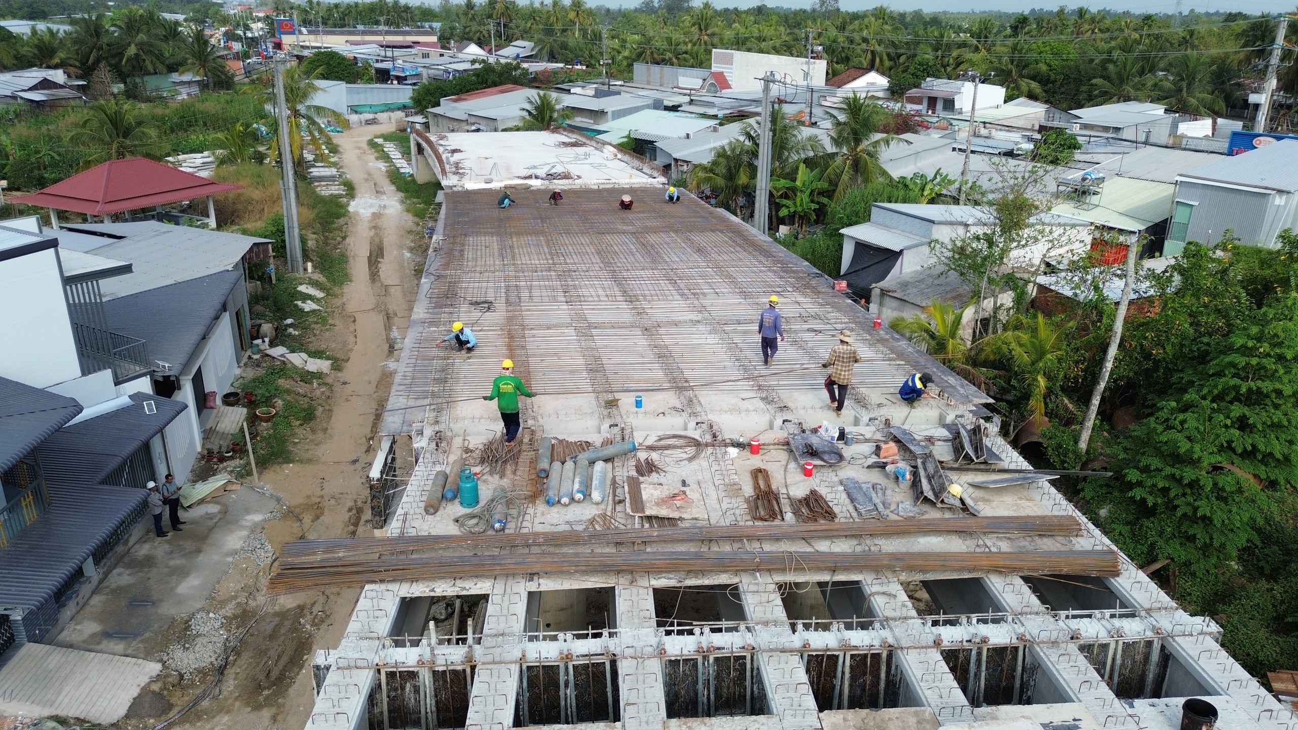 Đơn vị thi công đã gác dầm được 3 nhịp, đang thi công bản mặt cầu được 2 nhịp và đang thi công bê tông bản mặt cầu nhịp thứ 3.