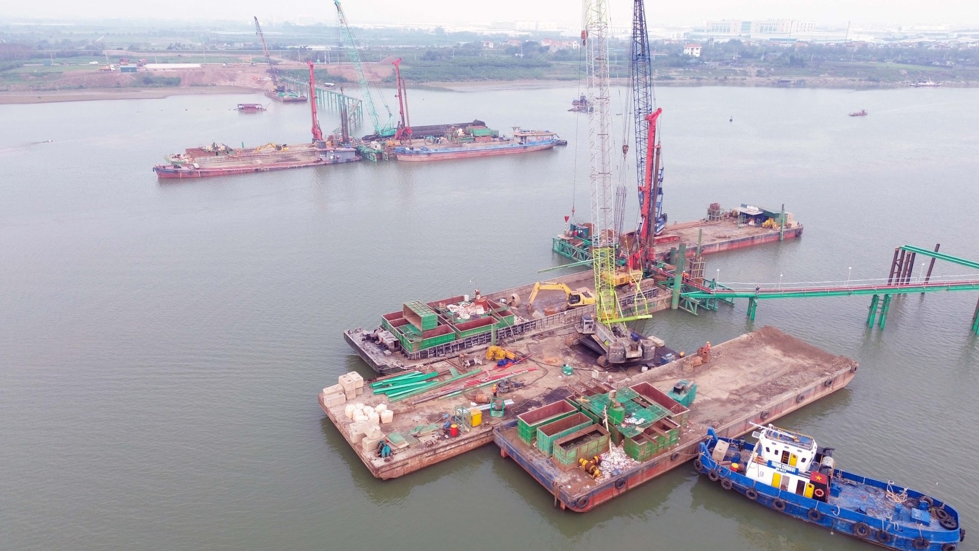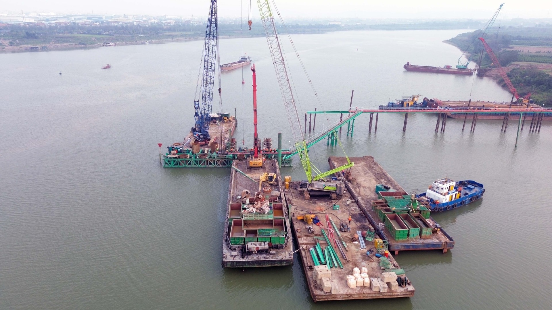 Theo ghi nhận thực tế, công trường xây dựng cầu vượt sông Đuống đang tập trung triển khai đồng loạt nhiều mũi thi công. Tại khu vực lòng sông, các nhà thầu đang đẩy nhanh tiến độ hoàn thiện các trụ cầu chính. Trong khi đó, ở hai đầu cầu phía xã Thuận An và khu dân cư Trung Mầu (xã Phù Đổng), công tác san lấp mặt bằng và chuẩn bị thi công trụ cạn đang được thực hiện gấp rút.