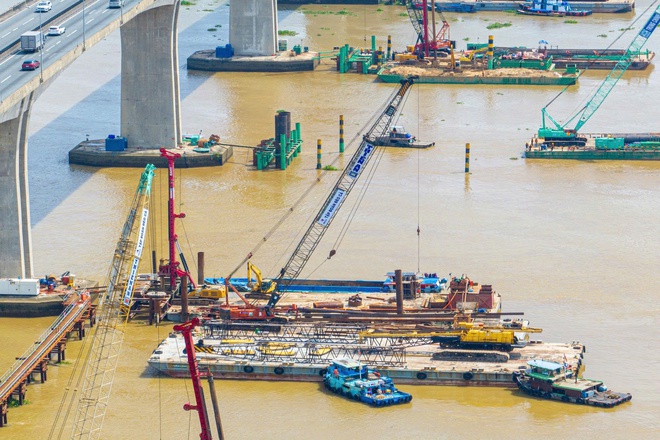 Tại khu vực cầu Long Thành (bắc qua sông Đồng Nai) là một trong những điểm thi công nhộn nhịp nhất của dự án hiện nay. Nhiều máy móc đang tập trung ở khu vực trên để thi công khoan cọc, thực hiện các bước tiến để đổ trụ cầu….