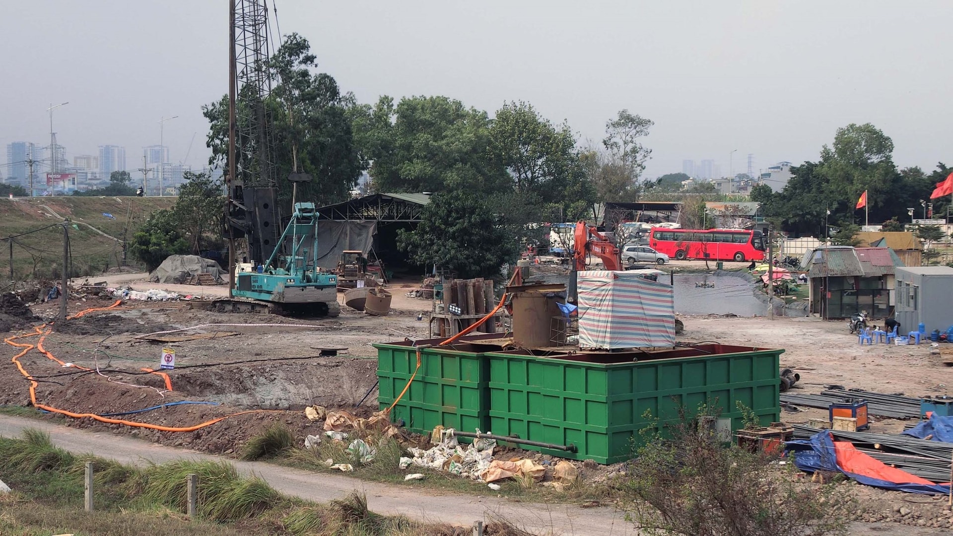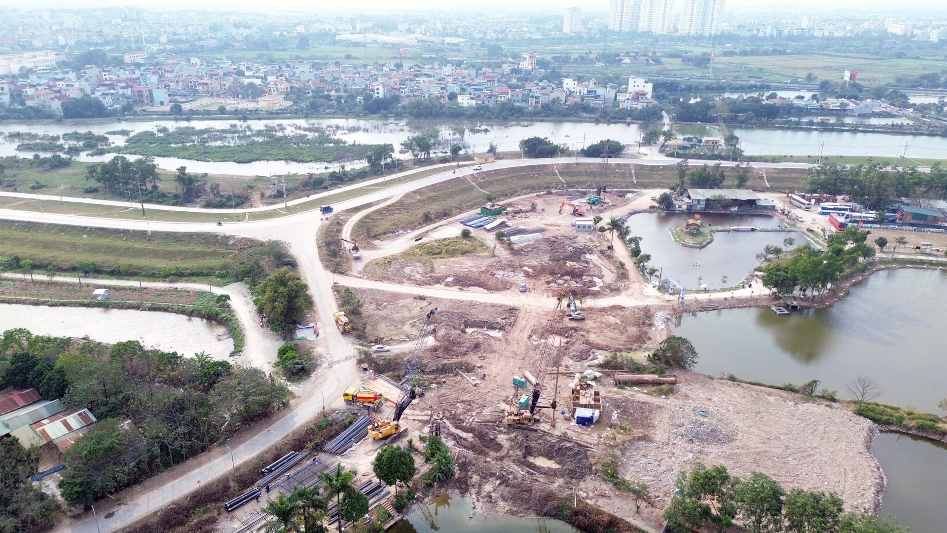 Tại địa bàn xã Thanh Trì (TP Hà Nội), các đơn vị thi công đang tập trung máy móc để xử lý nền hạ đoạn trước đây thuộc các xã Yên Mỹ, Duyên Hà và Ngũ Hiệp. Khu vực giáp đê Hữu Hồng, gần Khu trải nghiệm Vạn An, hiện đã thành hình tuyến đường dẫn với hoạt động san lấp nhộn nhịp.